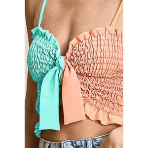 BiBi Woven Color Block Smocked with Ribbon Bra Top