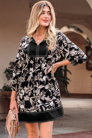 Black 3/4 Sleeve Botanical Print Split Neck Loose Mini Dress