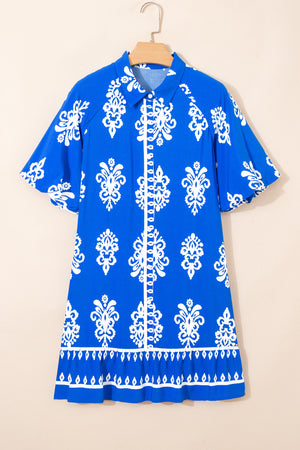Blue Ethnic Geometric Print Collared Button Front Short Puff Sleeve Mini Dress