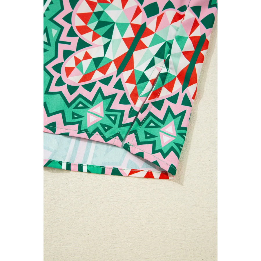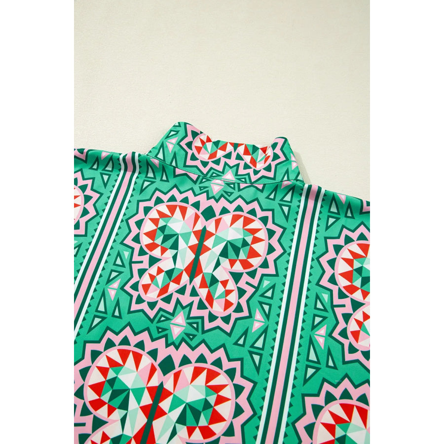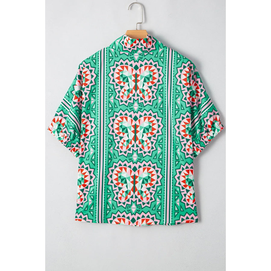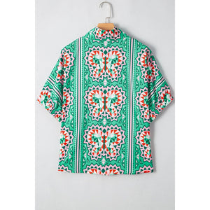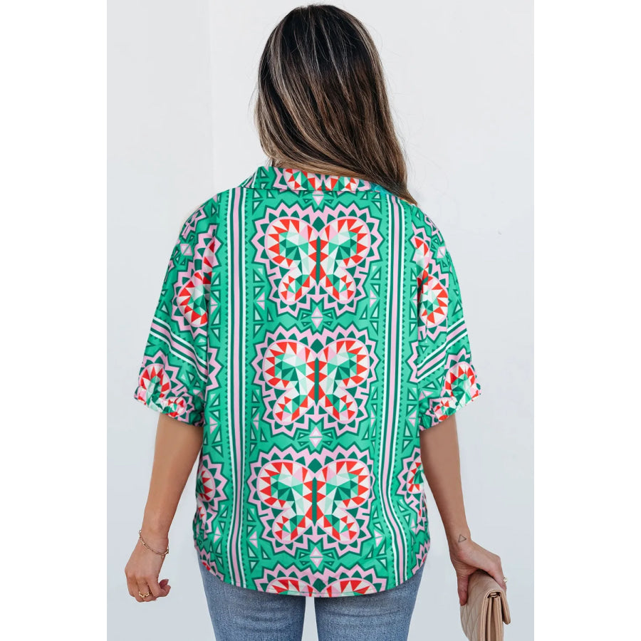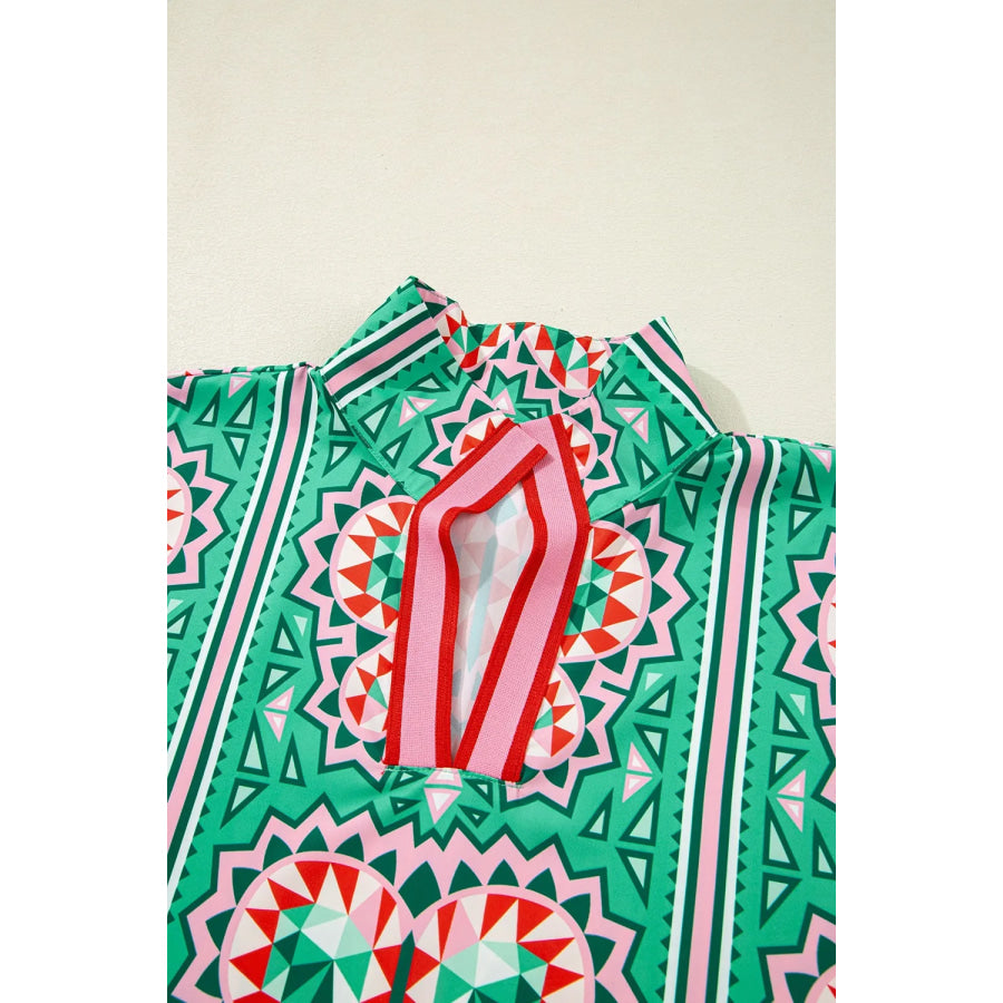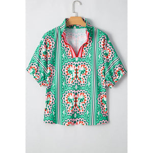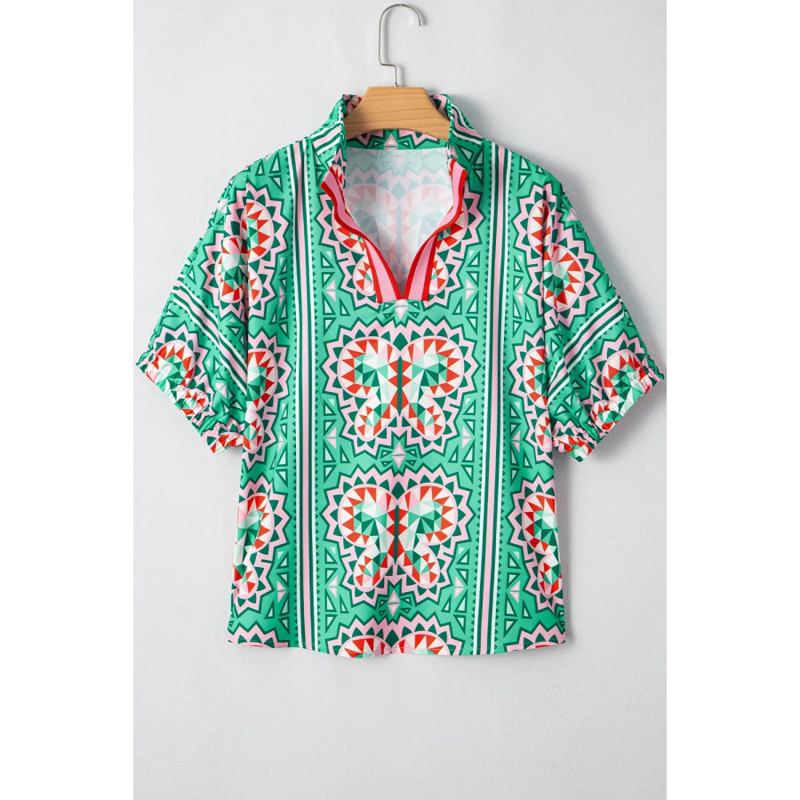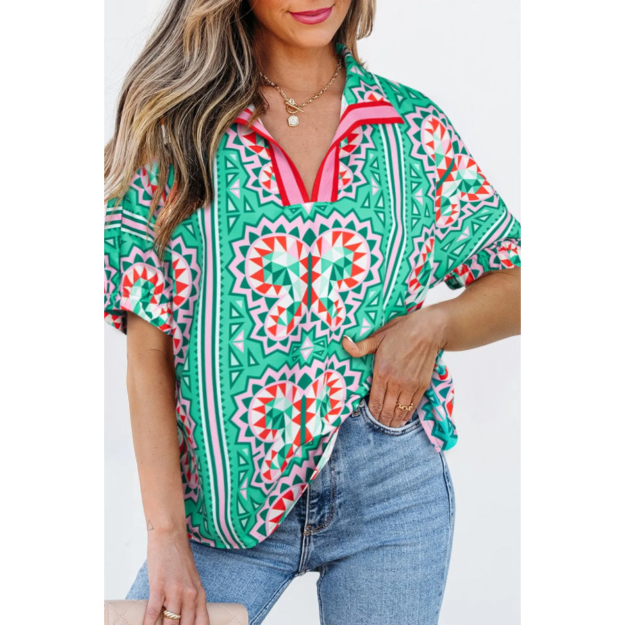 Boho Abstract Print Contrast Striped Collared V Neck Blouse
