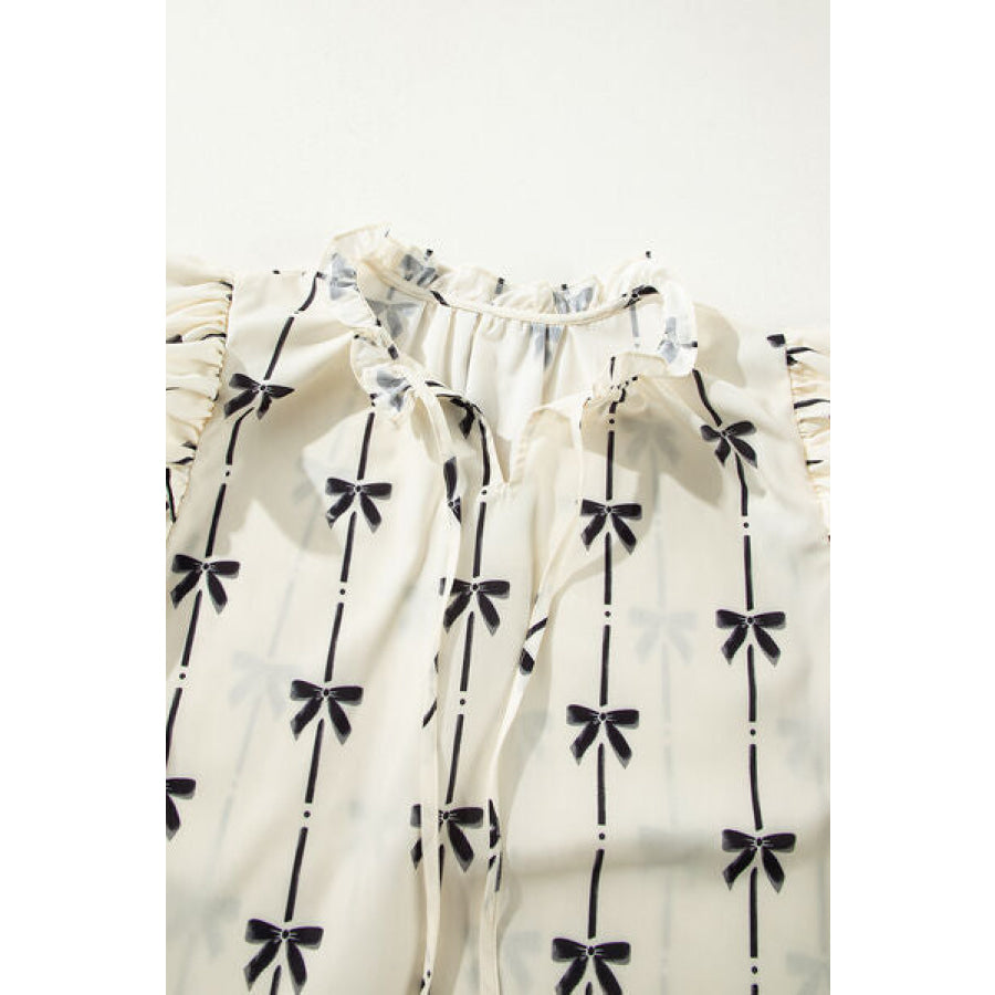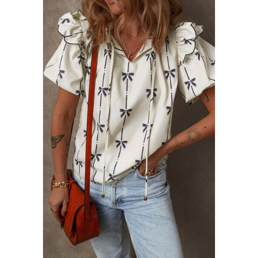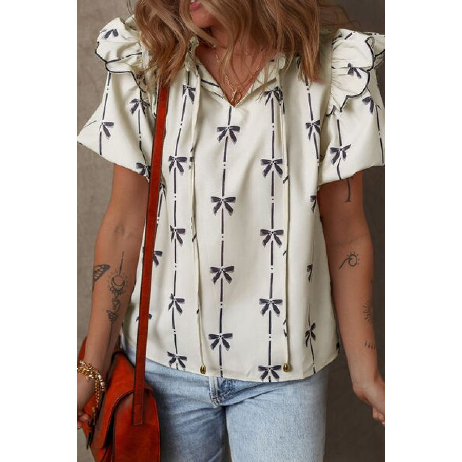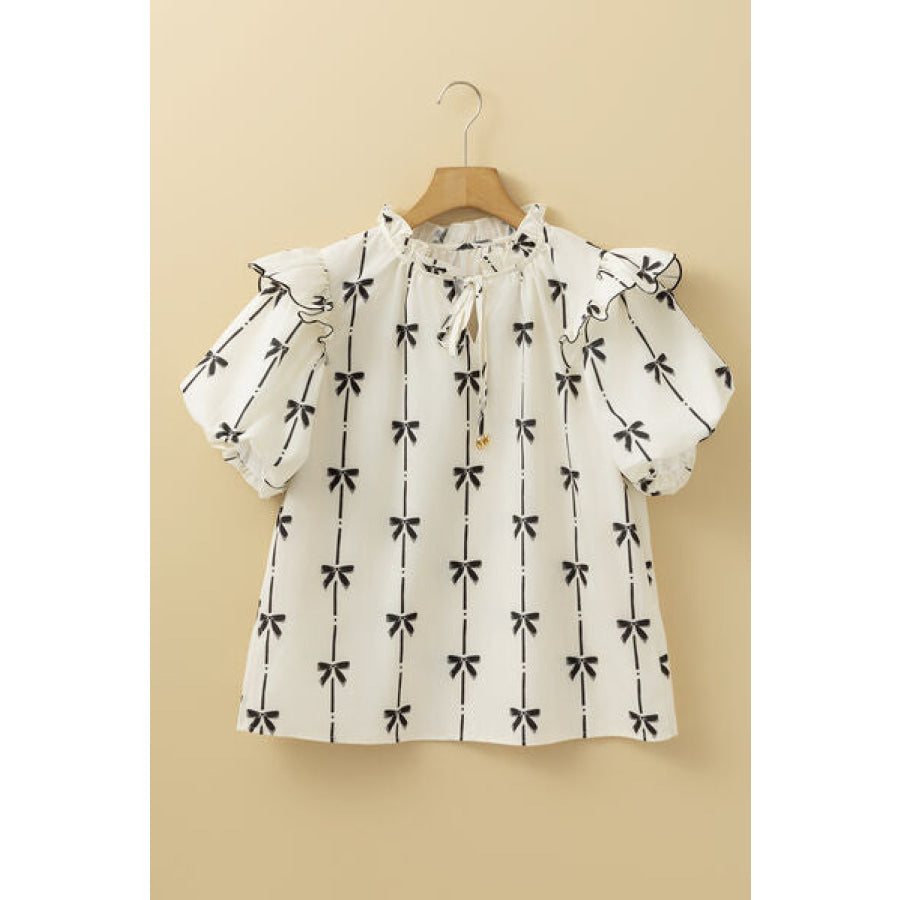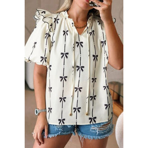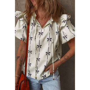 Bow Print Tie Neck Short Sleeve Blouse