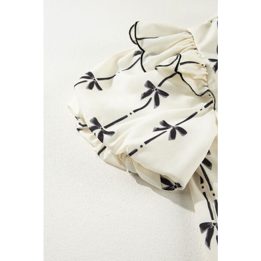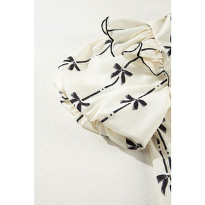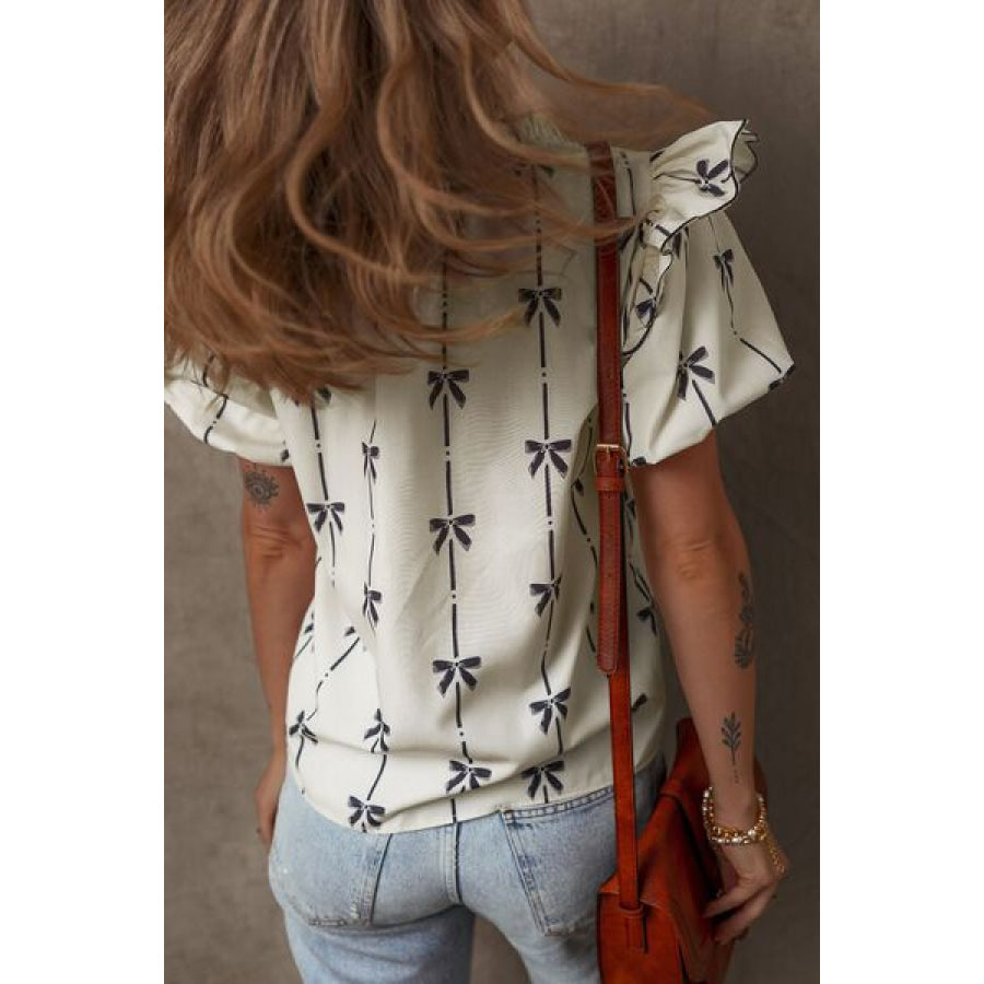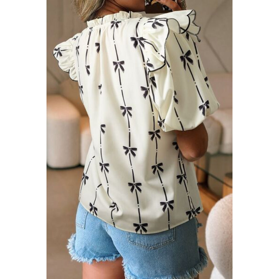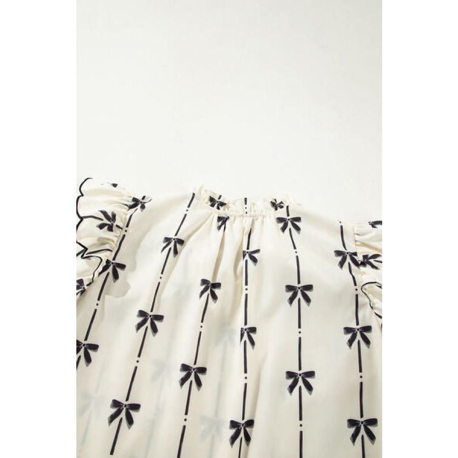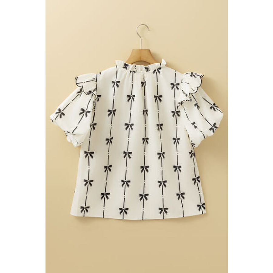 Bow Print Tie Neck Short Sleeve Blouse