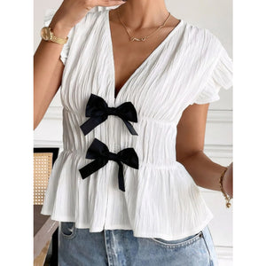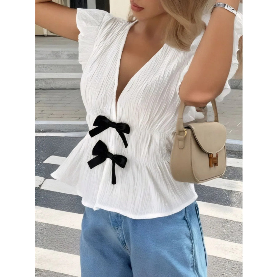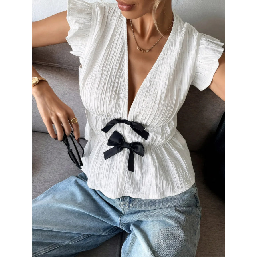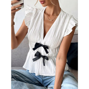 Bow V-Neck Cap Sleeve Blouse
