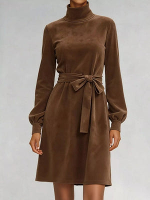 Bow Velvet Turtleneck Lantern Sleeve Dress