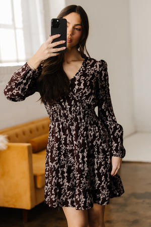 Brown Ditsy Floral Print Split Neck Long Sleeve Shirred Waist Flared Mini Dress
