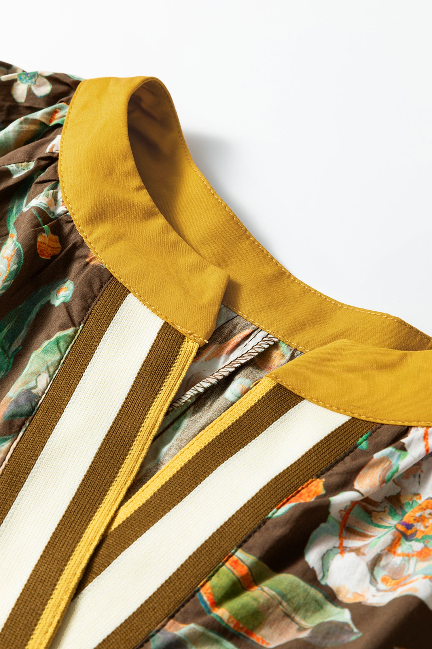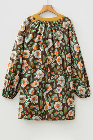 Brown Floral Print Contrast Trim V Neck Pocketed Long Sleeve Mini Dress