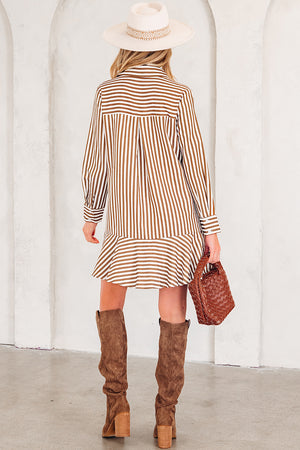 Brown Stripe Ruffled Hem Collared Long Sleeve Shirt Mini Dress
