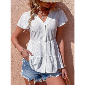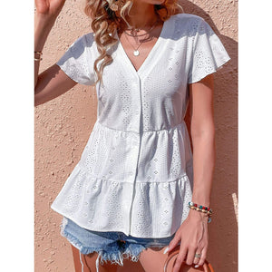 Button Front Eyelet Flutter Sleeve Tiered Blouse