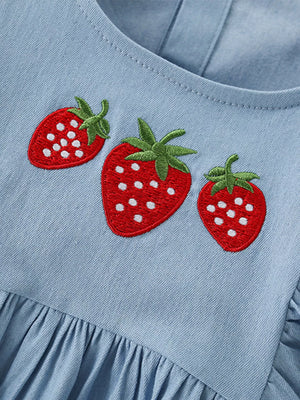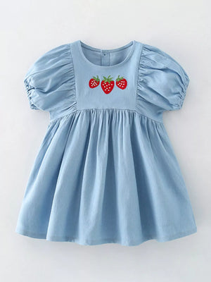 Children's Strawberry Embroidered Puff Sleeve Denim Dress
