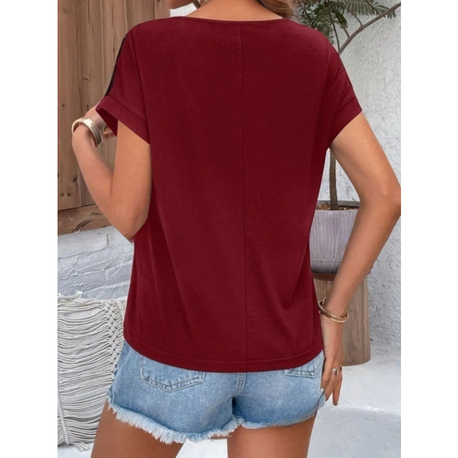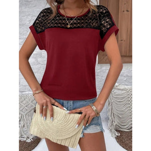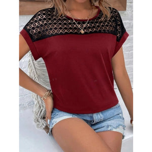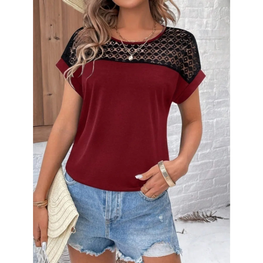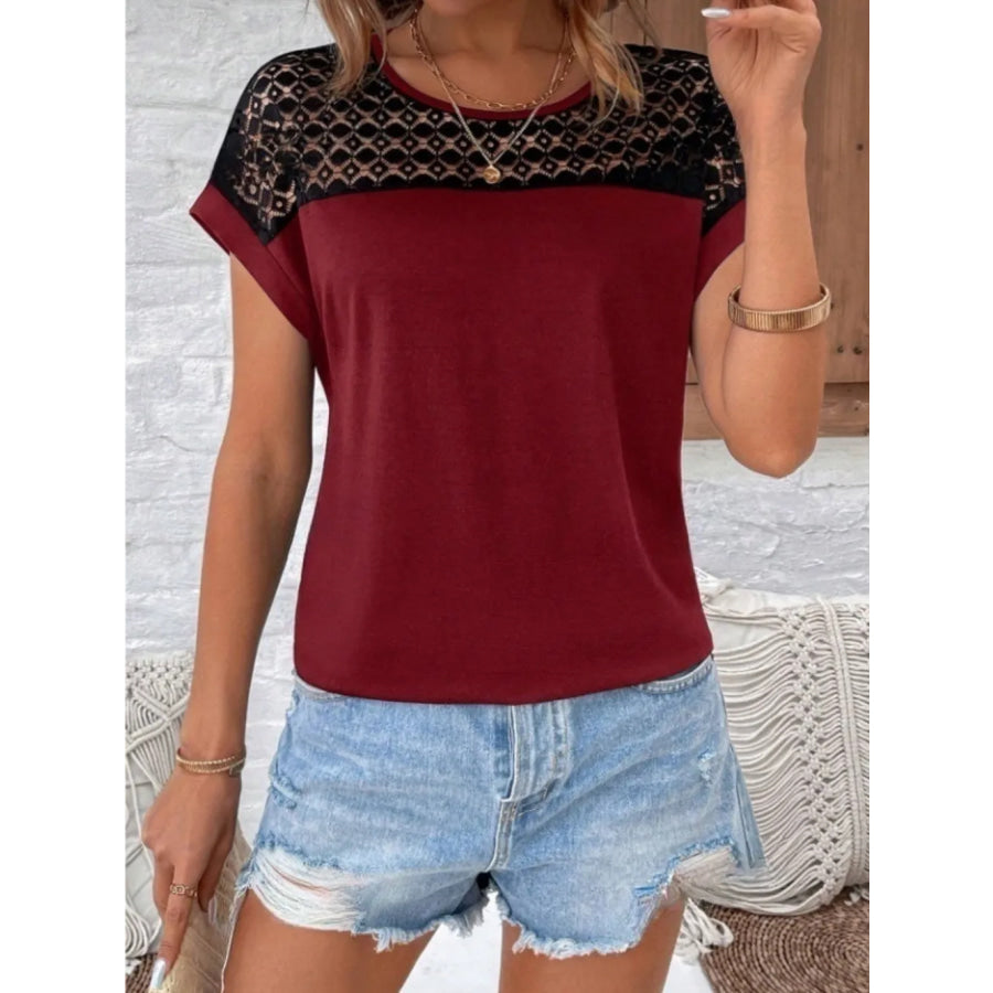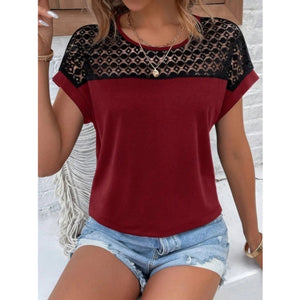 Contrast Lace Round Neck Short Sleeve Blouse