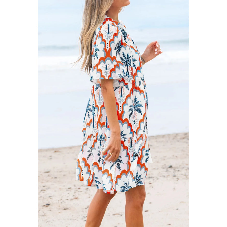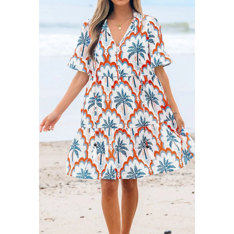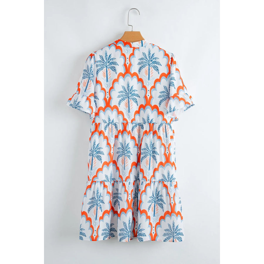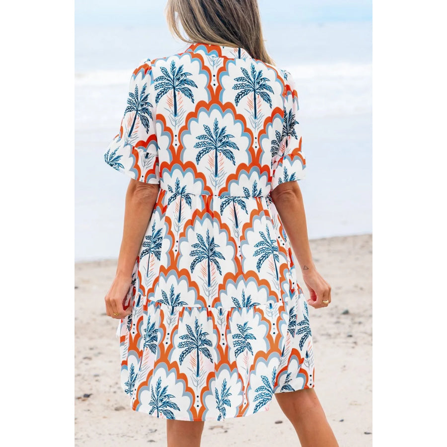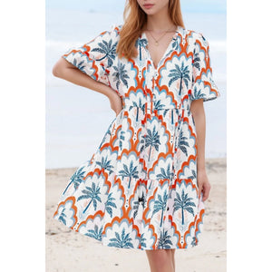 Contrast Palm Tree Printed Short Sleeve Flowy Dress