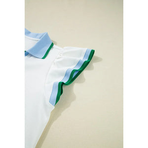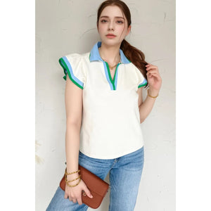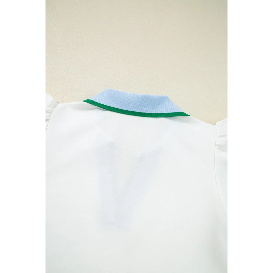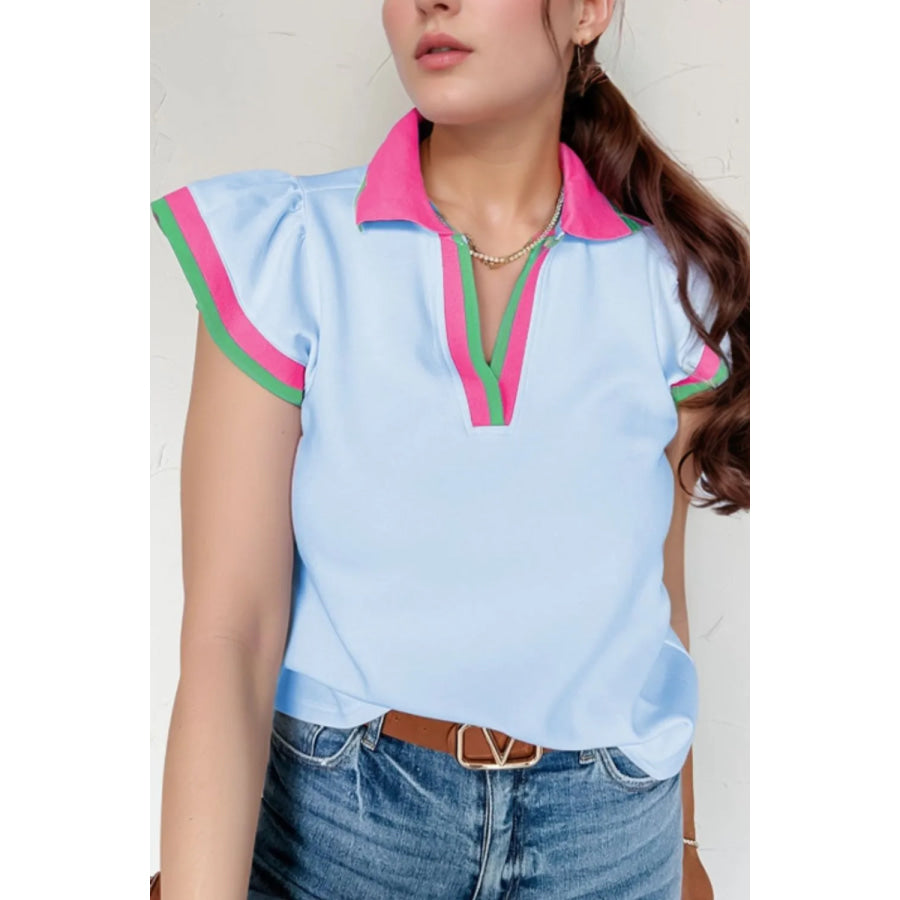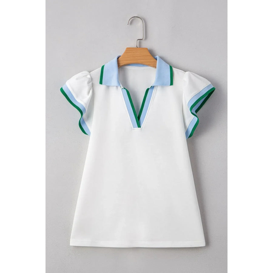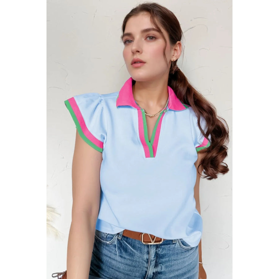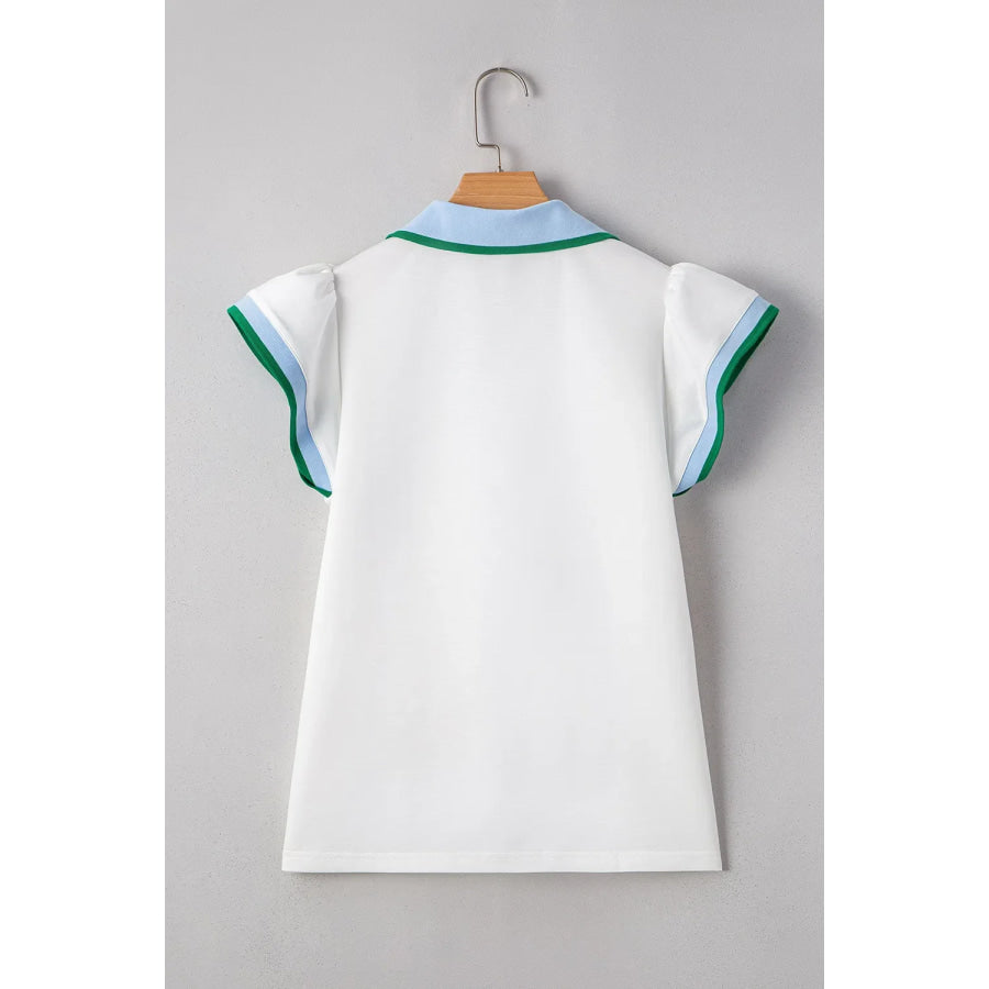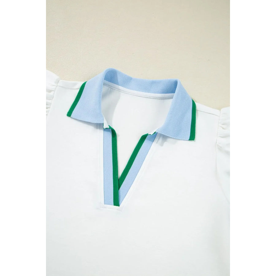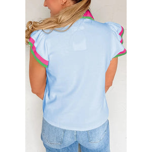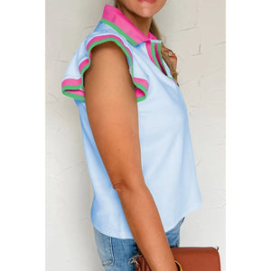 Contrast Ruffled Sleeve Collared V Neck Blouse