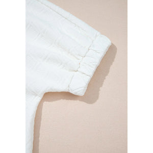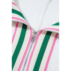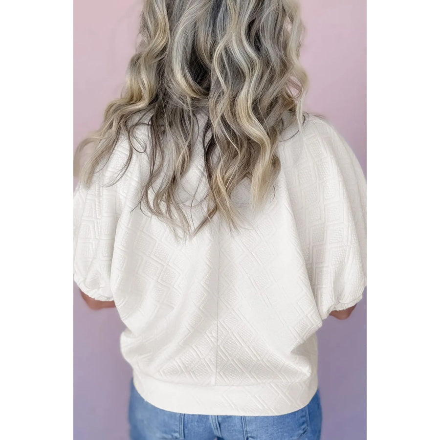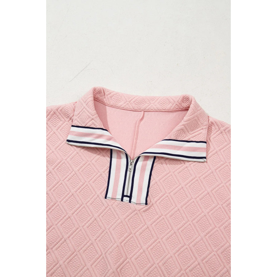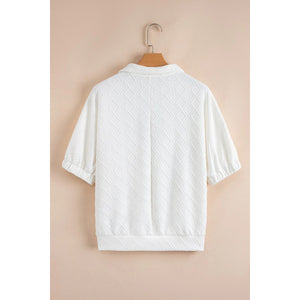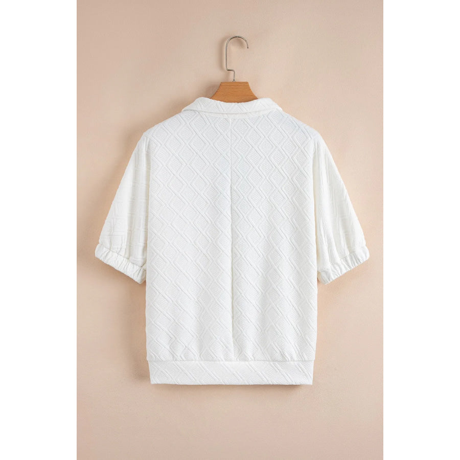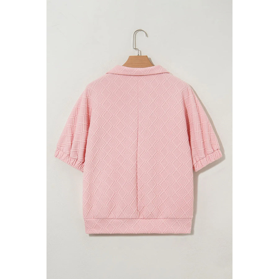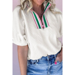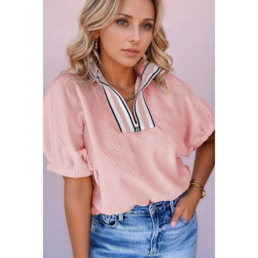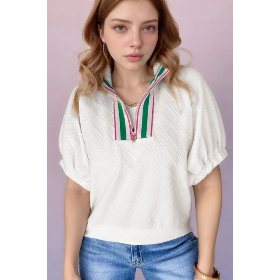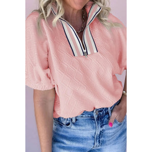 Contrast Striped Collar Patchwork Textured Half Sleeve Blouse
