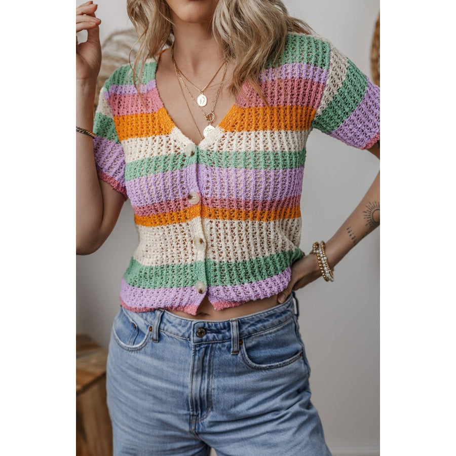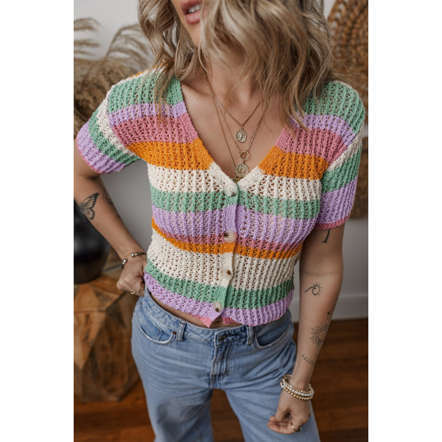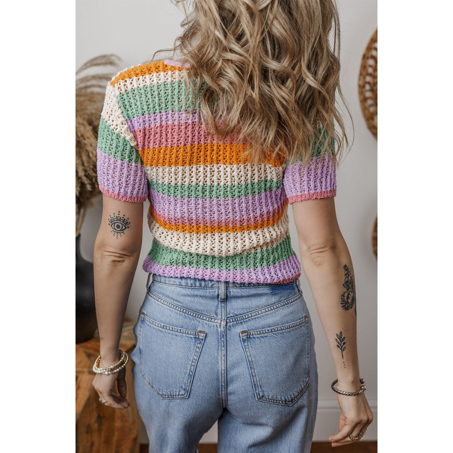 Contrast Striped V Neck Short Sleeve Pointelle Knit Top
