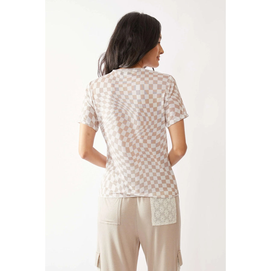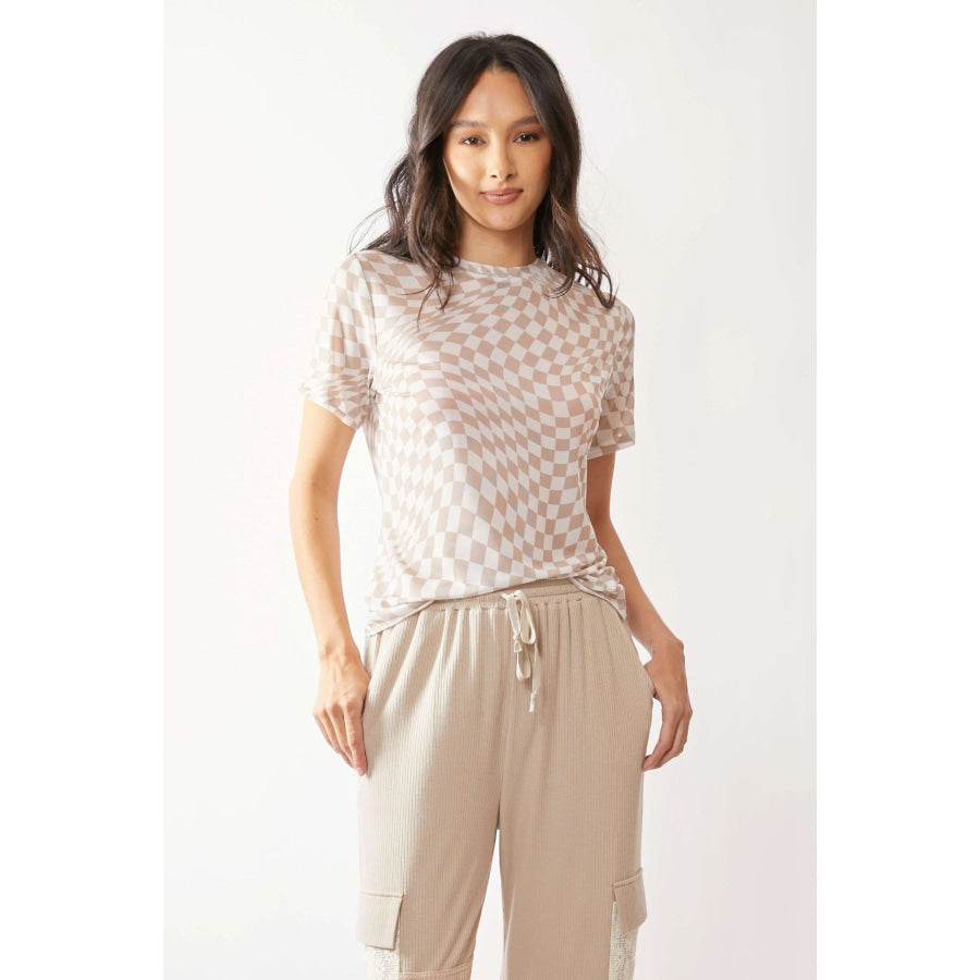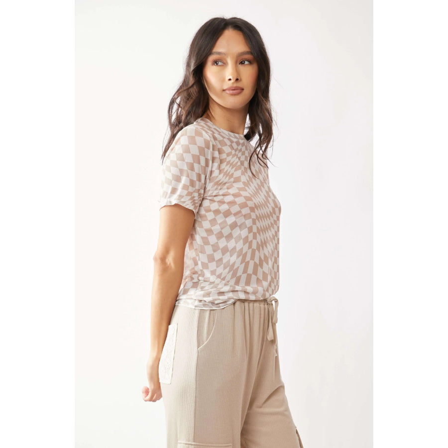 Davi & Dani Checker Board Printed Mesh Short Sleeve Top