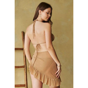 This elegant three-piece swim set features a stunning metallic brown finish with sophisticated shimmer effect. The set includes a triangle bikini top with adjustable ties, matching bottom, and a coordinating wrap skirt with feminine ruffle detail. Made from high-quality stretchy swim fabric that offers both comfort and style. The wrap skirt features an asymmetrical hem with romantic ruffle trim that can be adjusted for desired coverage. Perfect for beach parties, resort wear, or poolside lounging. The metallic finish catches the light beautifully while the design provides a flattering fit for various body types.