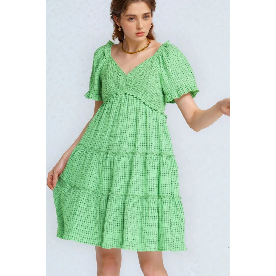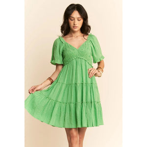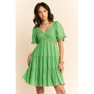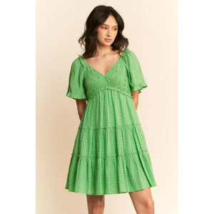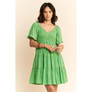 This charming midi dress features a classic gingham pattern in fresh green, perfect for warm-weather occasions. The design includes romantic flutter sleeves, a flattering empire waistline, and triple-tiered skirt construction. Made from lightweight, breathable fabric, this dress combines vintage-inspired prairie elements with modern styling. The V-neckline is enhanced with delicate ruffles, while the tiered structure creates movement and visual interest. Ideal for casual outings, garden parties, or summer events.
