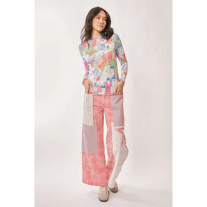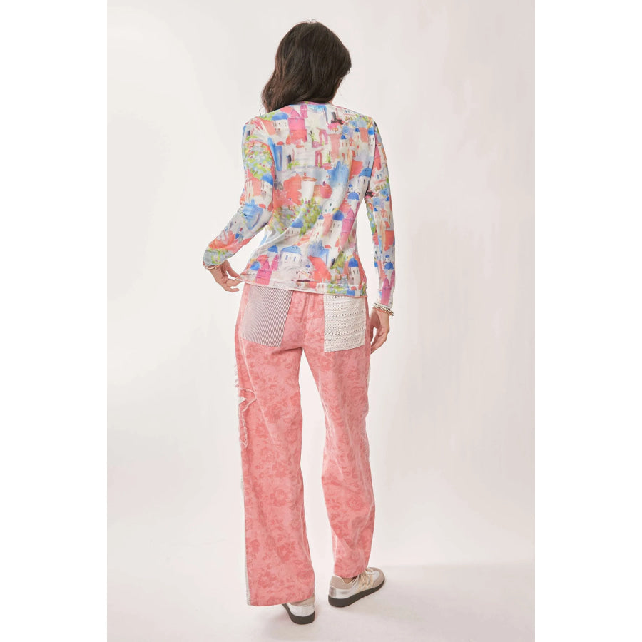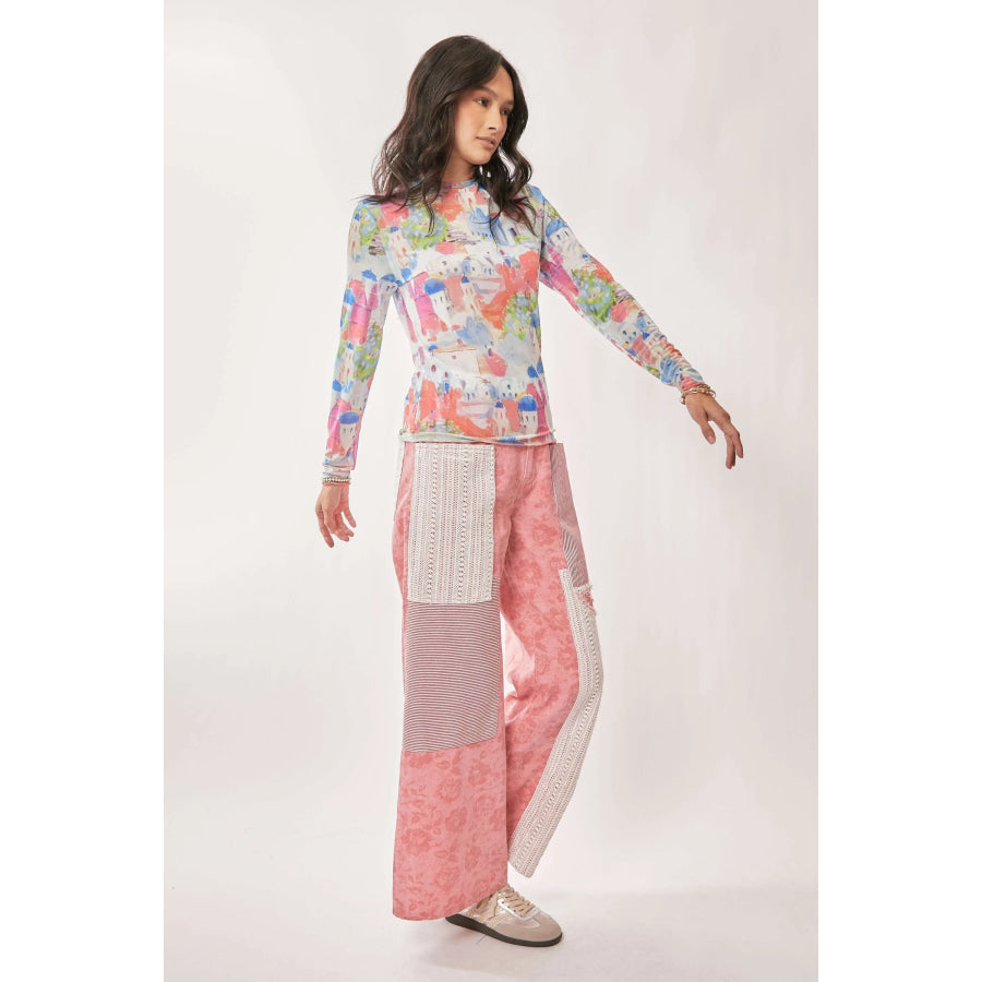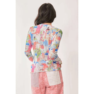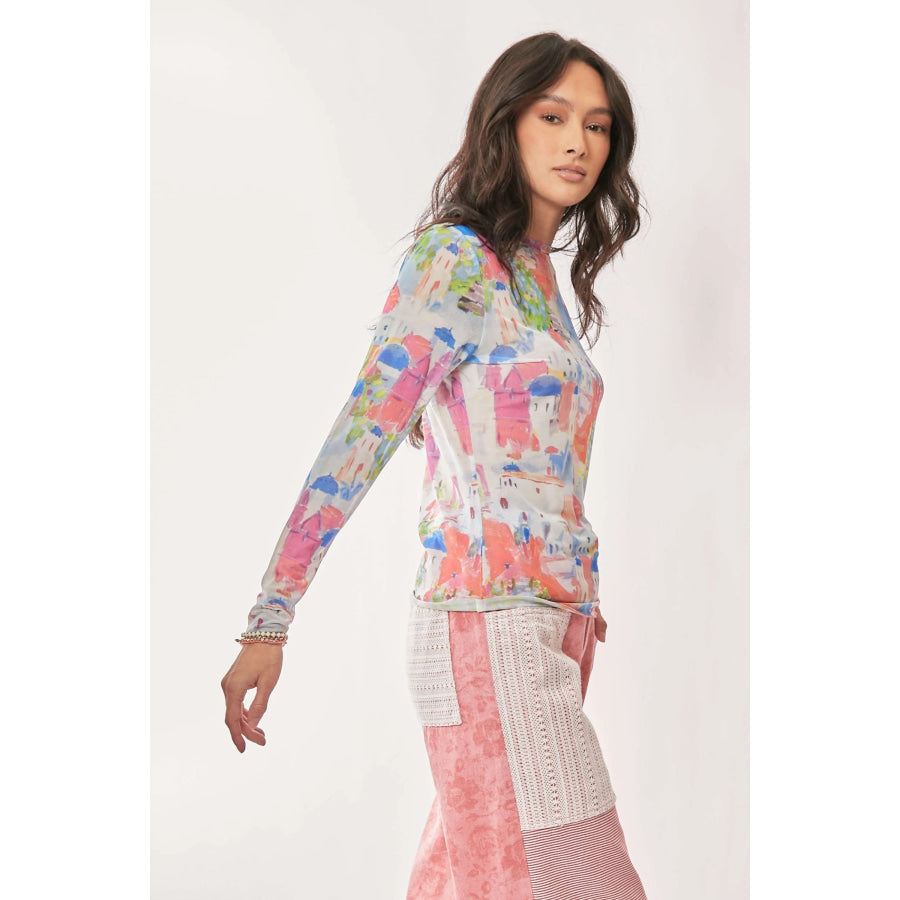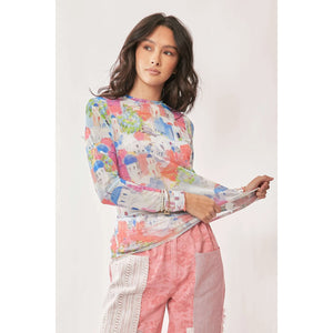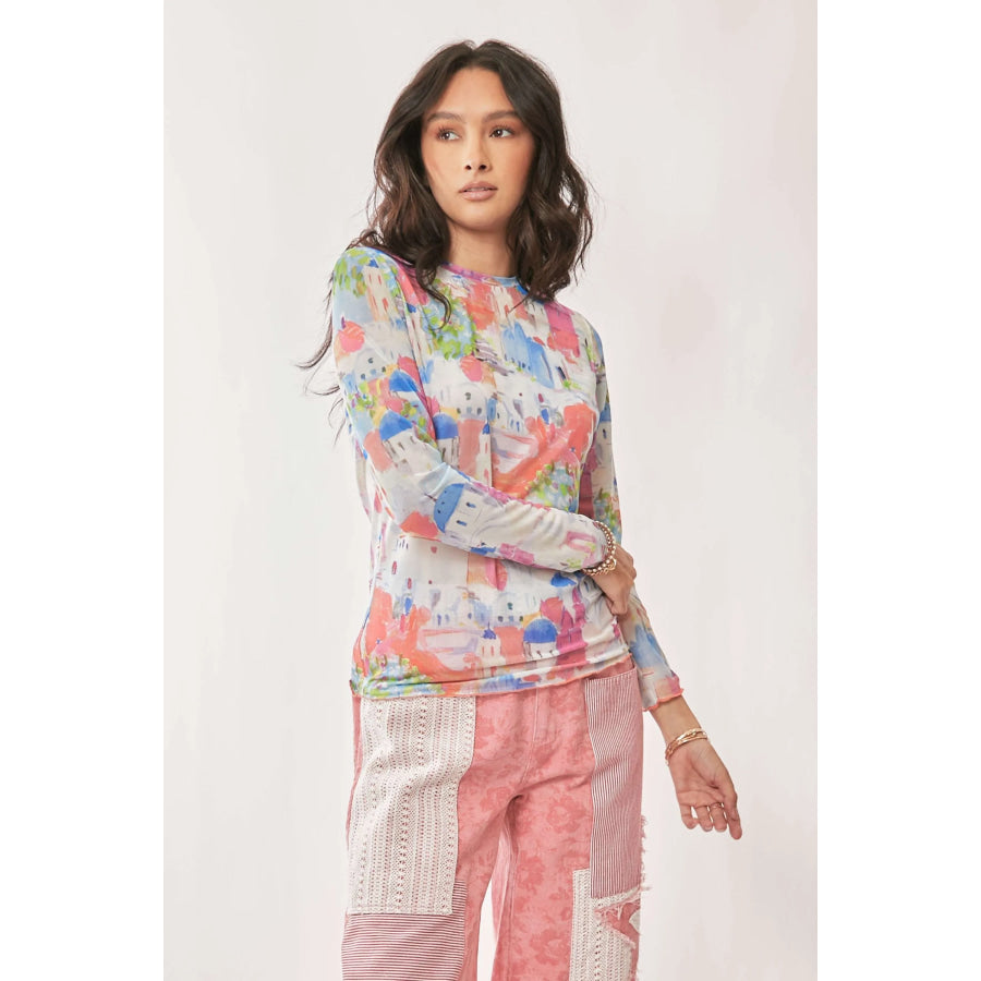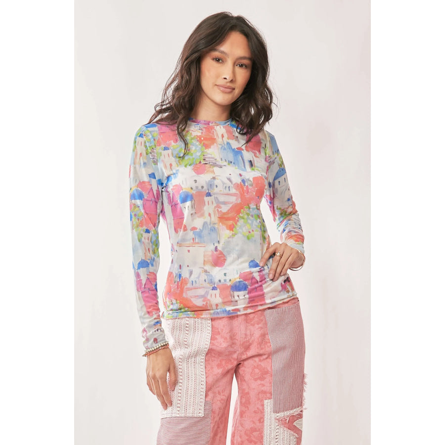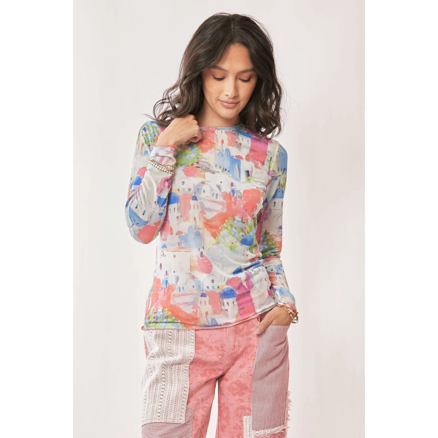 Davi & Dani Multi Printed Mesh Round Neck Long Sleeve Top