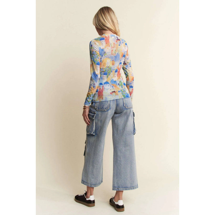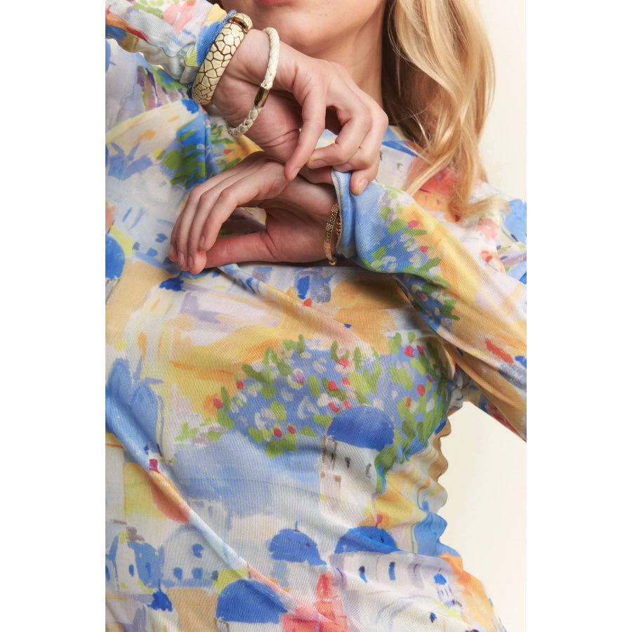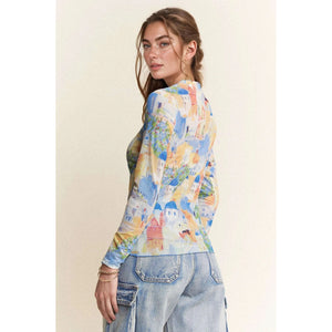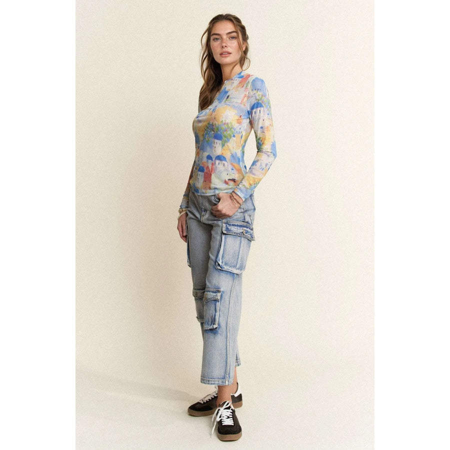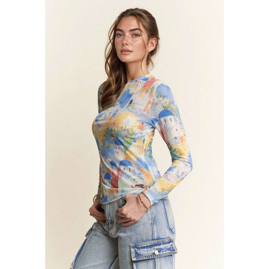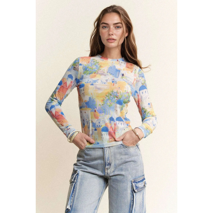 Davi & Dani Multi Printed Mesh Round Neck Long Sleeve Top
