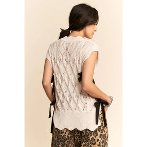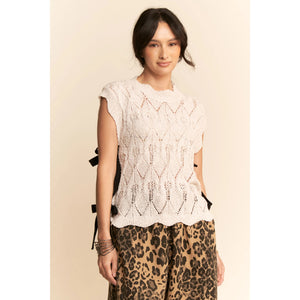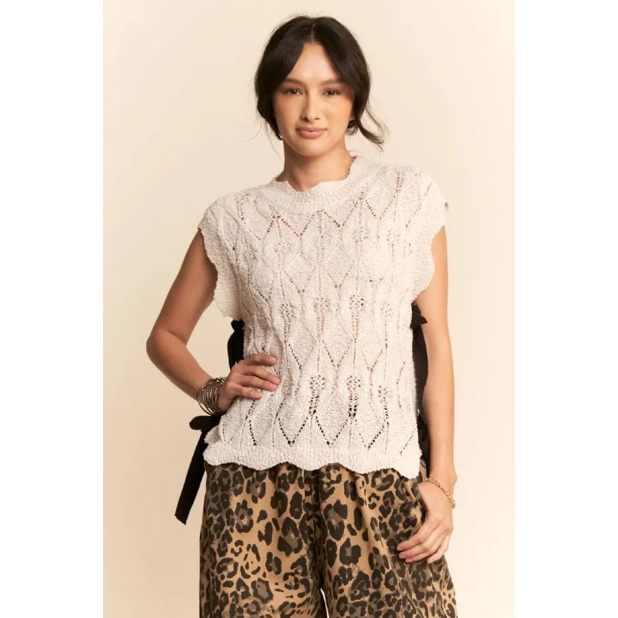 Davi & Dani Ribbon Bow Ties Scalloped Trim Knit Semi Crop Top