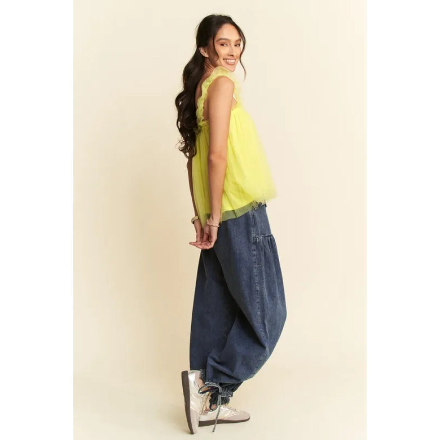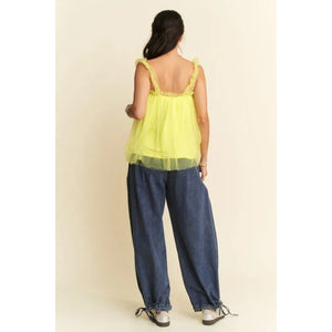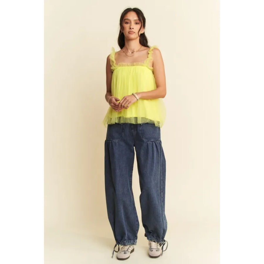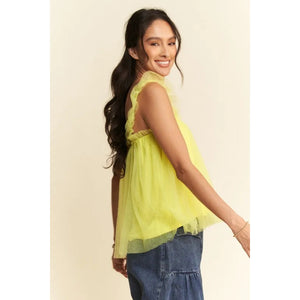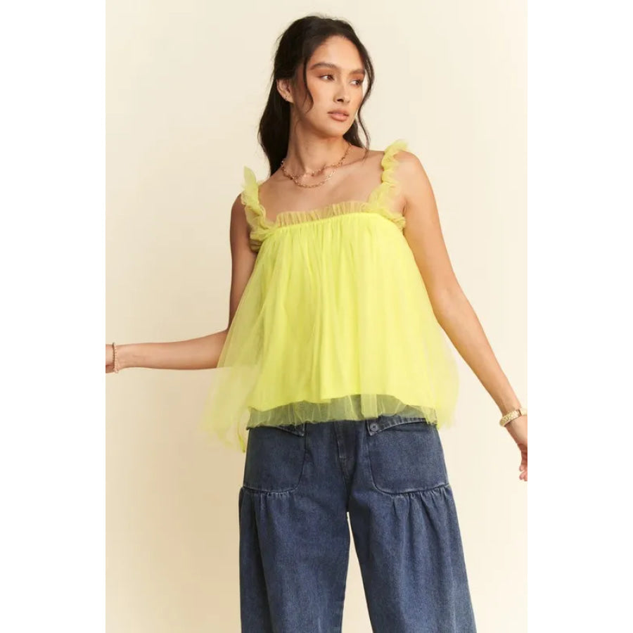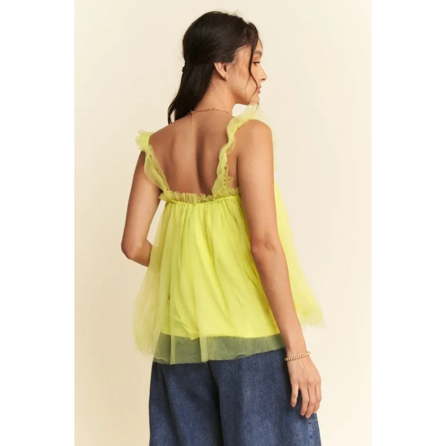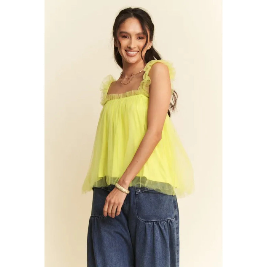 Davi & Dani Shirred Ruffle Strap Tulle Babydoll Top
