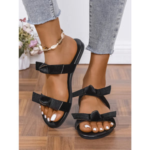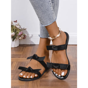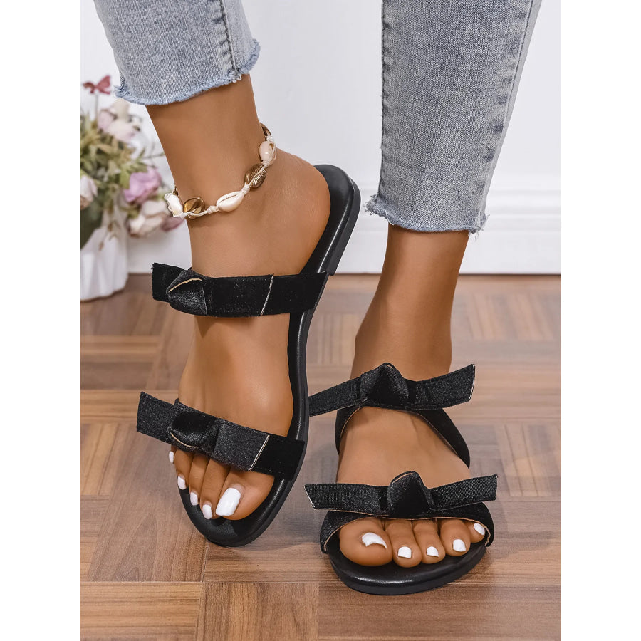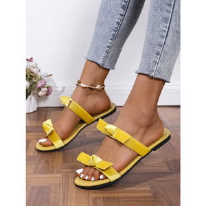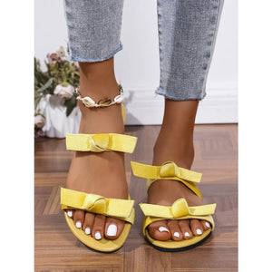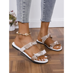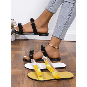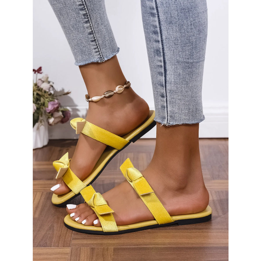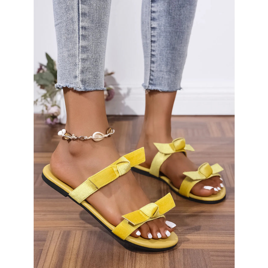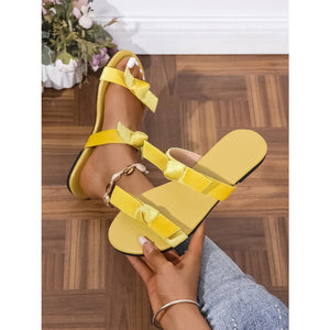These contemporary double strap flat sandals showcase a minimalist design perfect for casual everyday wear. Featuring two parallel straps made from high-quality synthetic material, these sandals offer both style and comfort. The flat rubber sole provides excellent traction and durability. Available in classic black, crisp white, and vibrant yellow options, these versatile sandals pair easily with any summer outfit. The adjustable straps ensure a secure and comfortable fit, while the slip-on design allows for easy wearing. Ideal for warm weather and casual occasions, these sandals combine modern aesthetics with practical functionality.