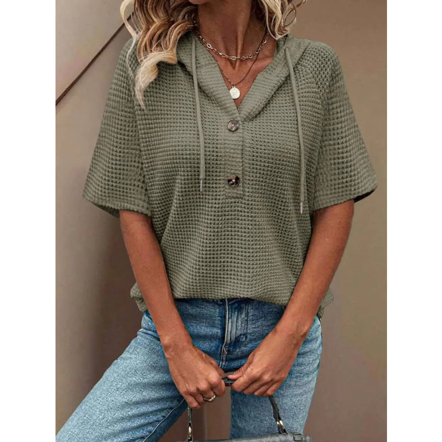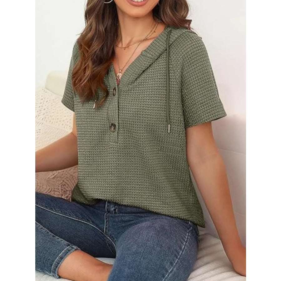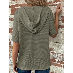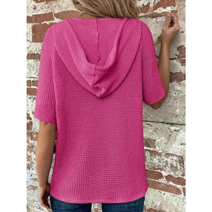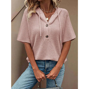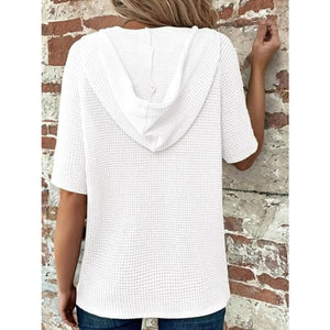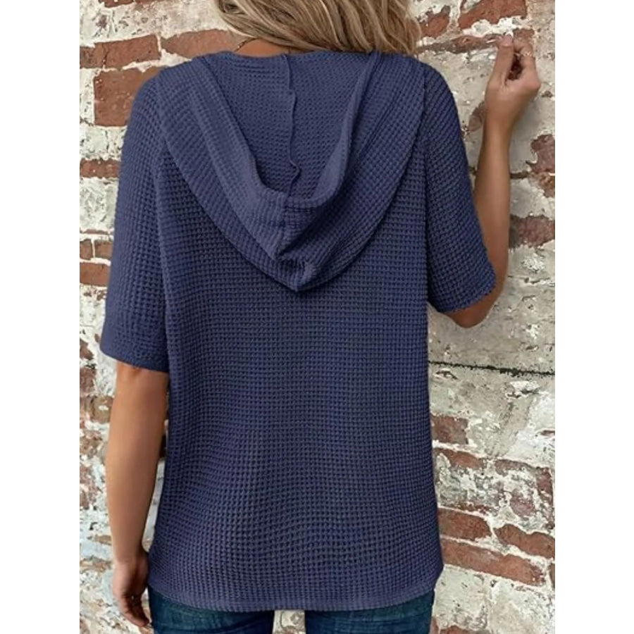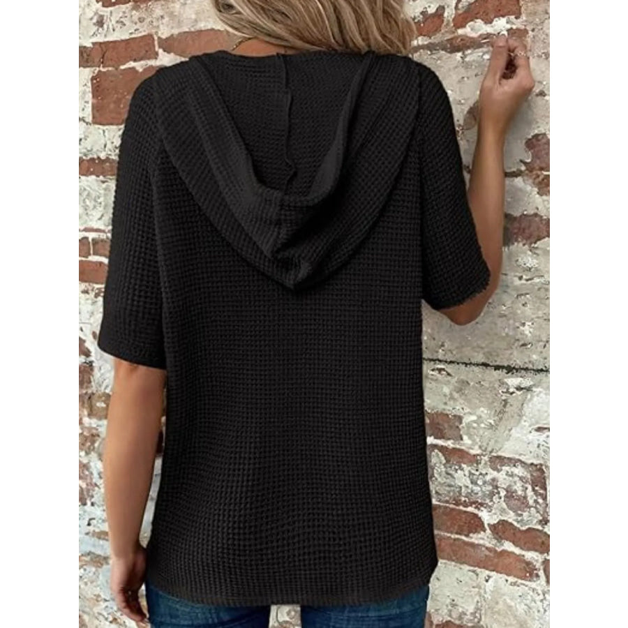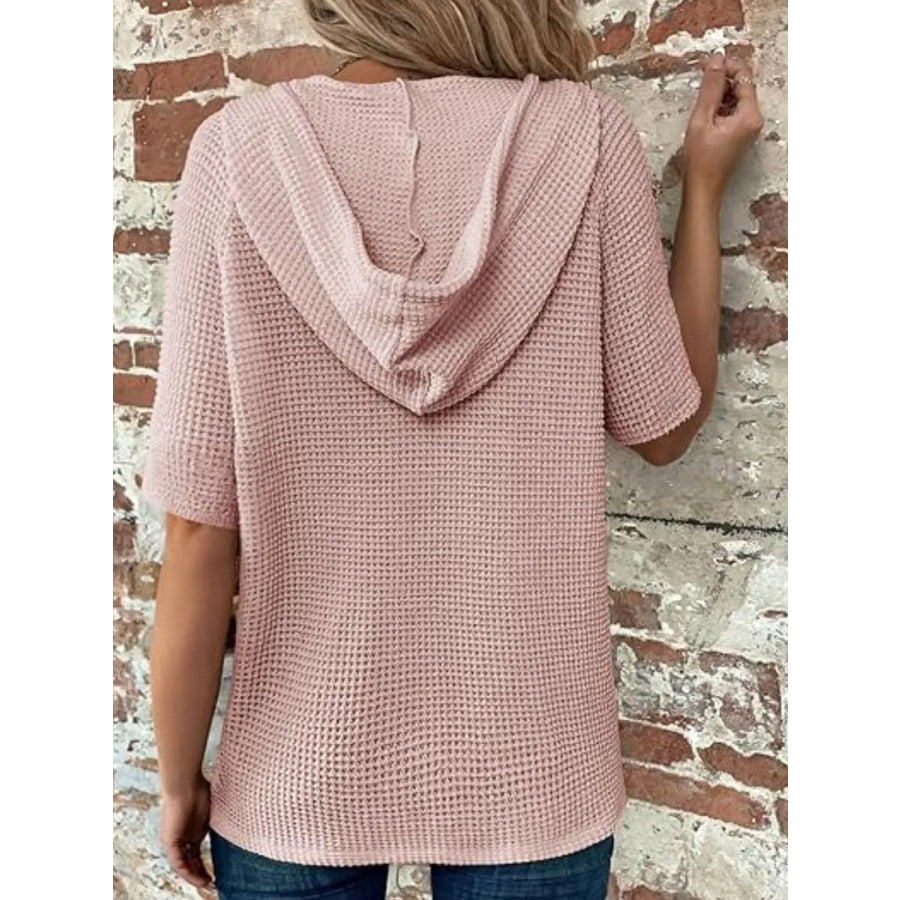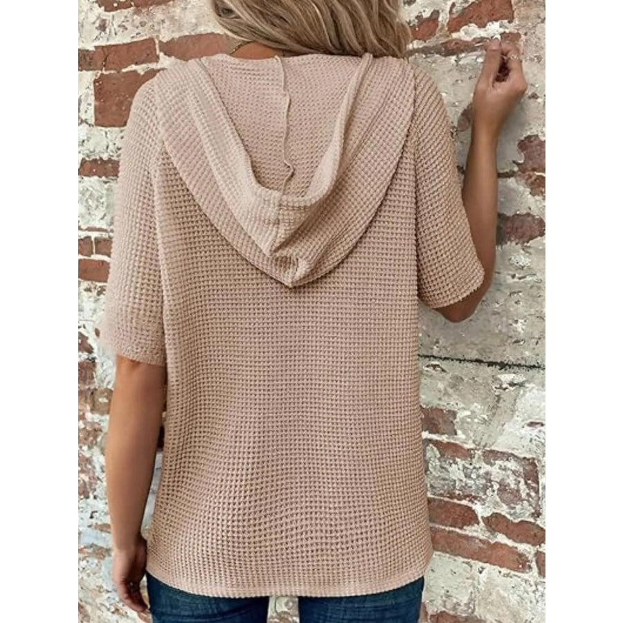 Drawstring Waffle-Knit Short Sleeve Hooded Top