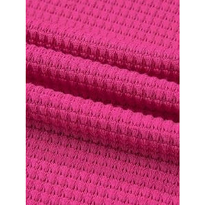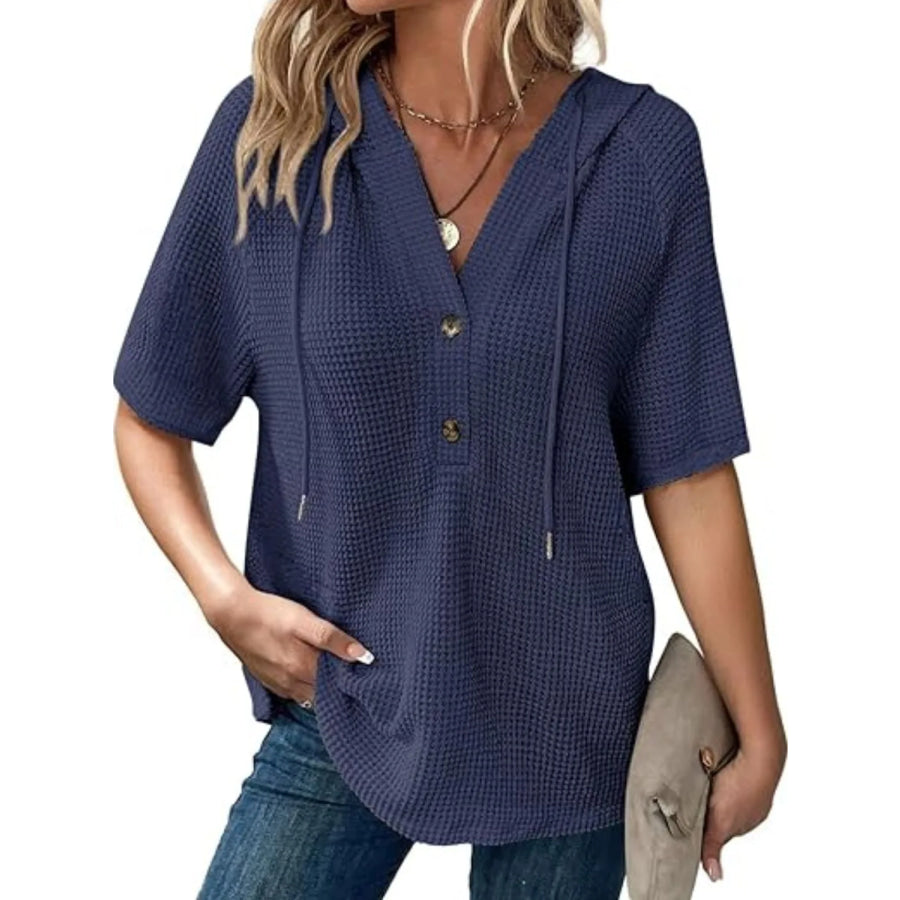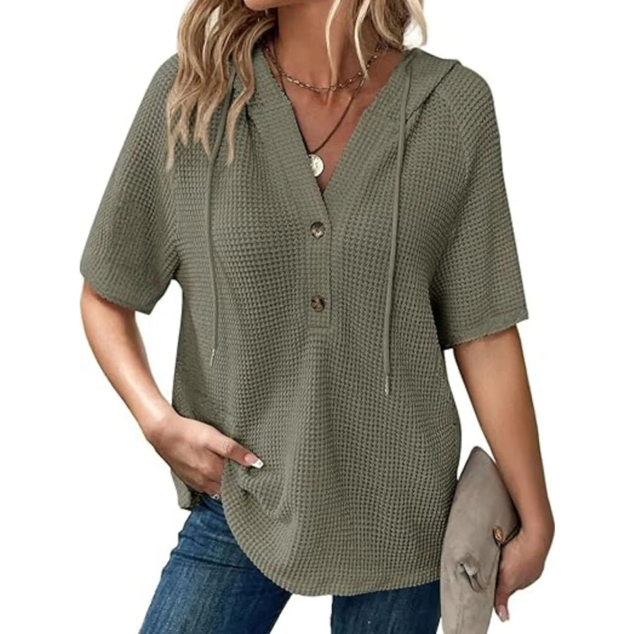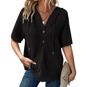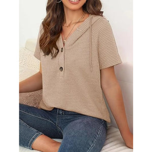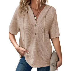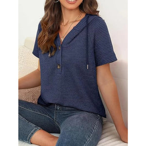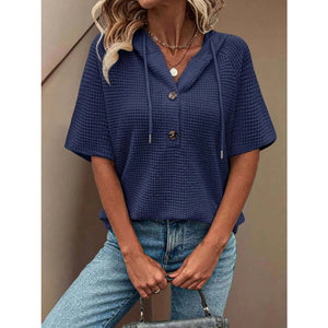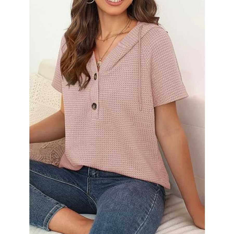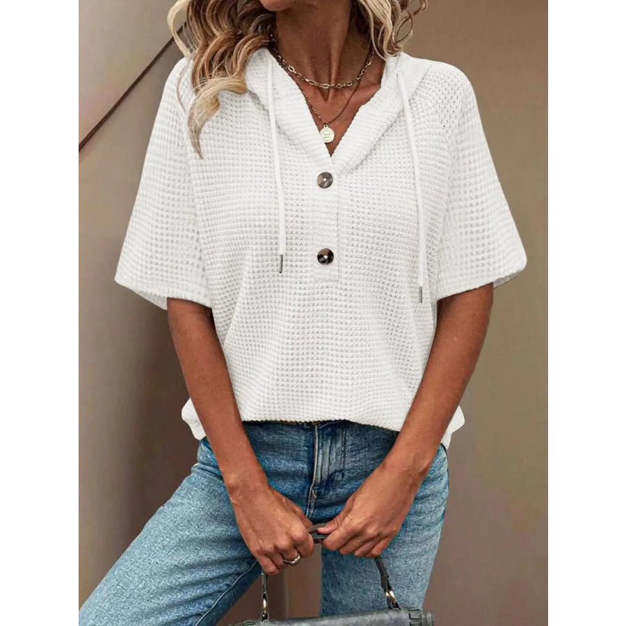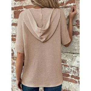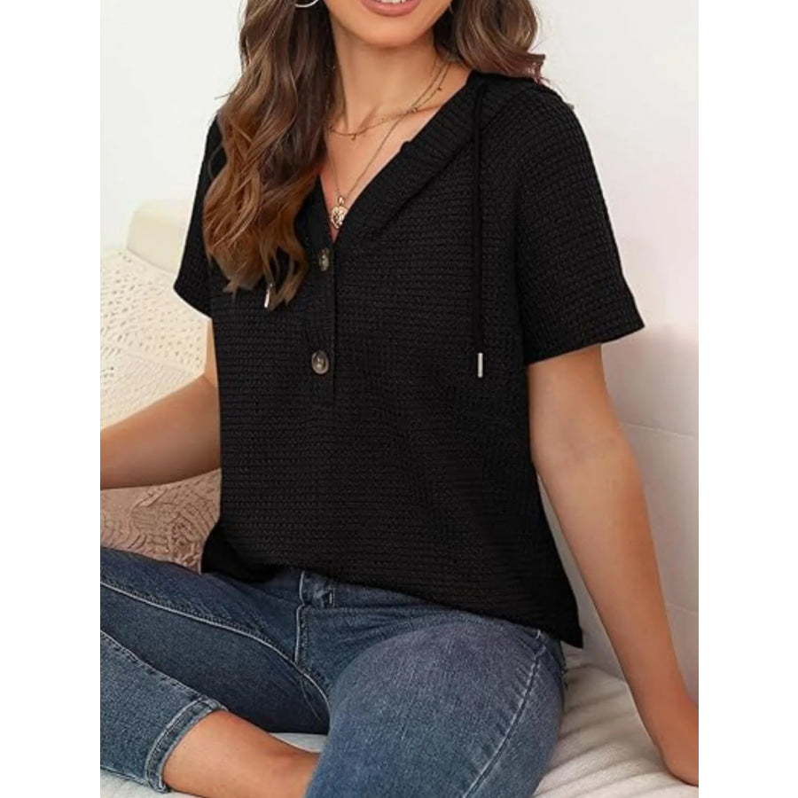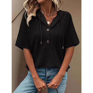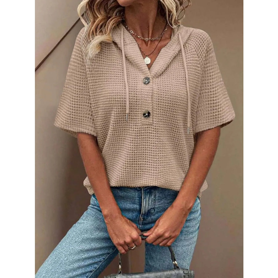 Drawstring Waffle-Knit Short Sleeve Hooded Top