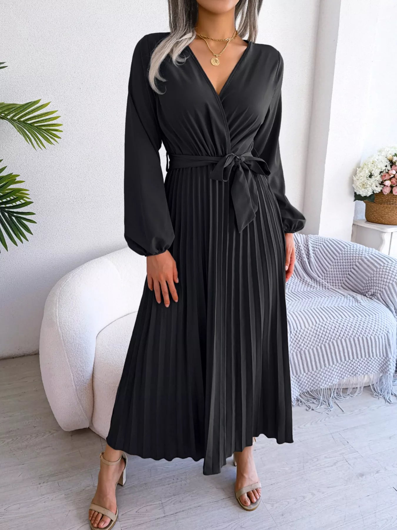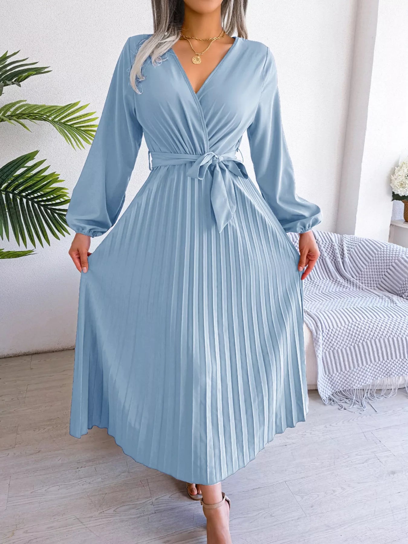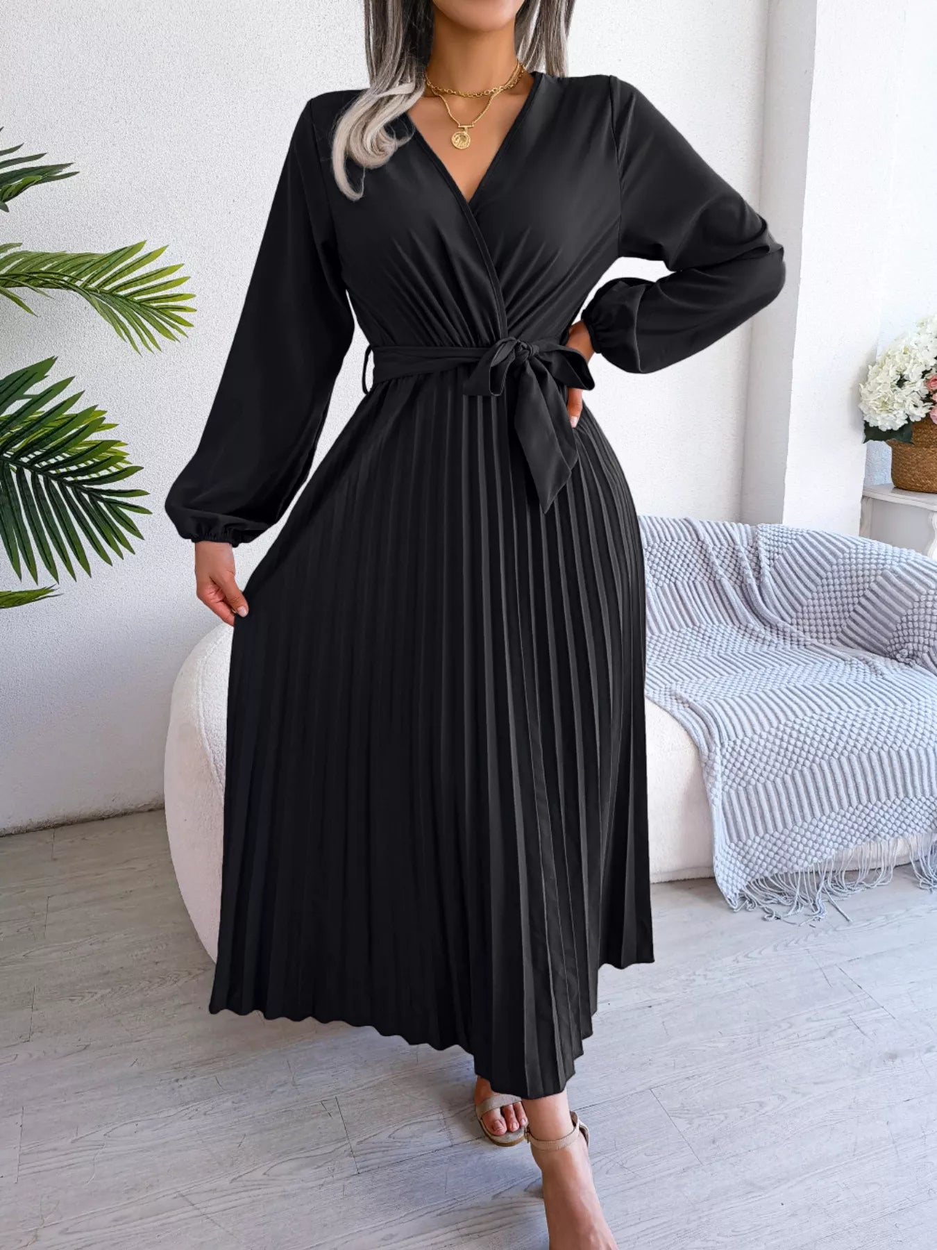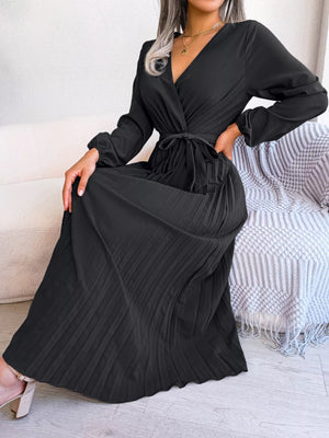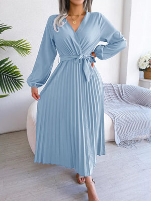 Elegant Pleated Front Tie Long Sleeve Dress
