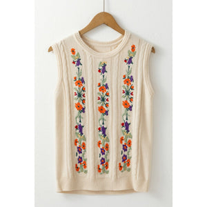 Embroidered Cable-Knit Round Neck Sweater Vest