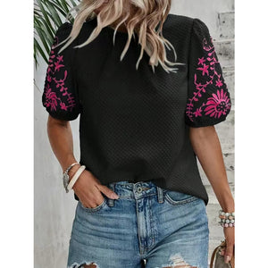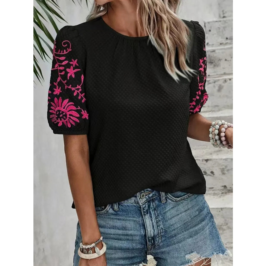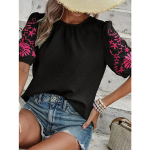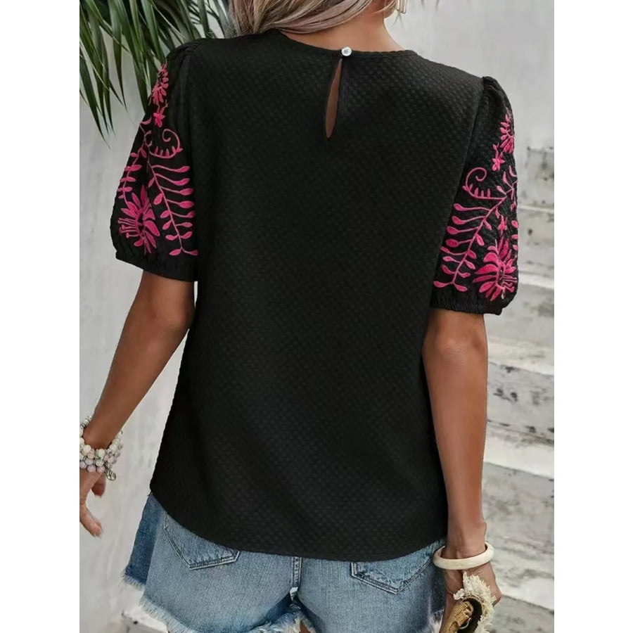 Embroidered Round Neck Short Sleeve Blouse
