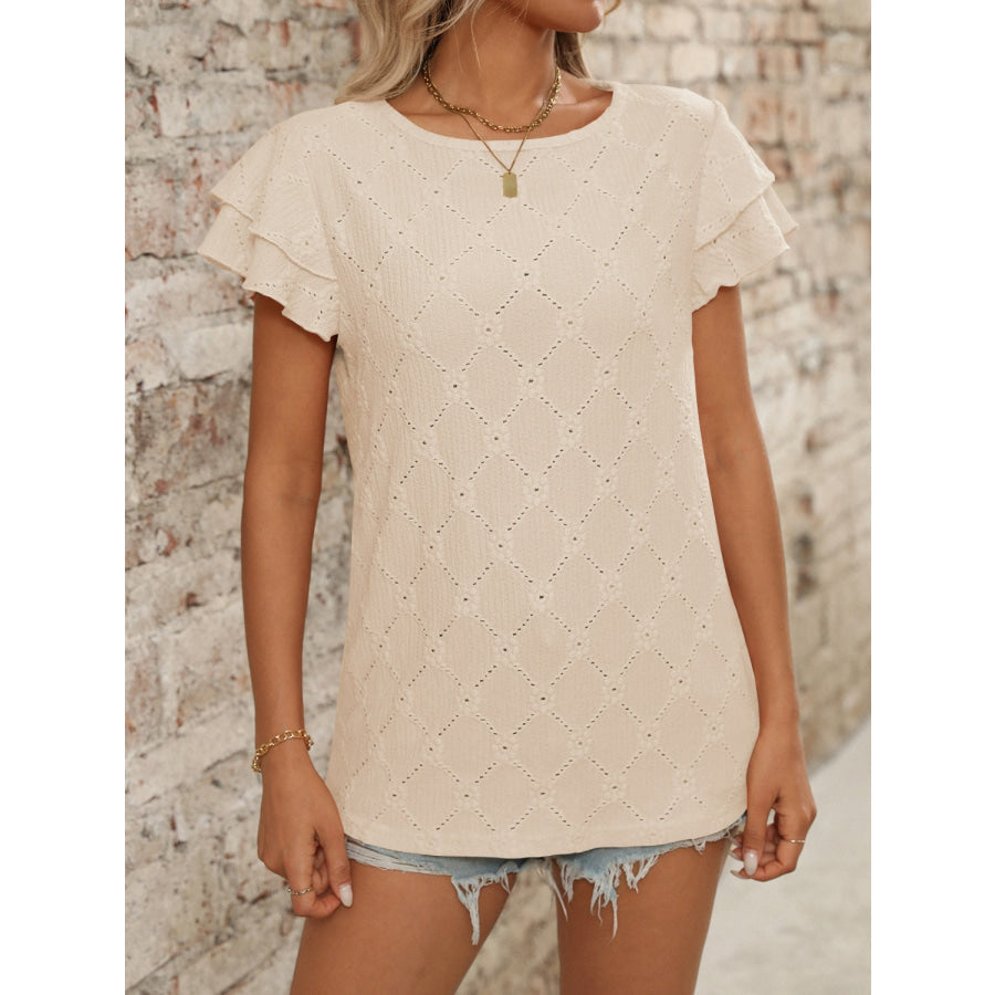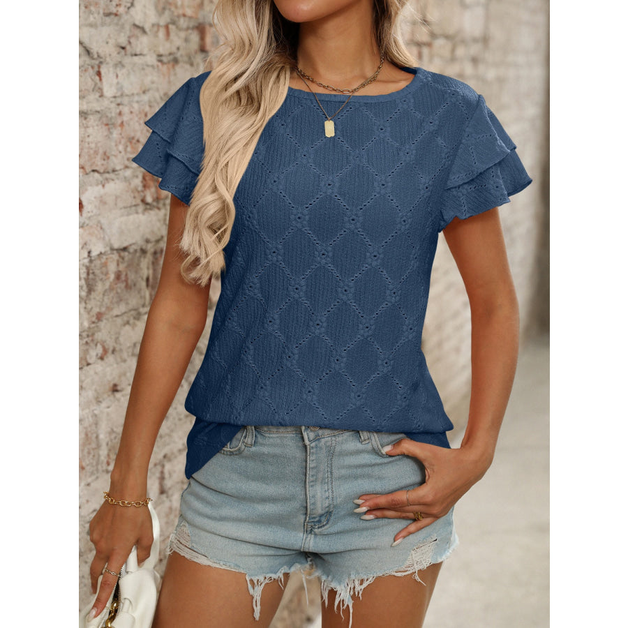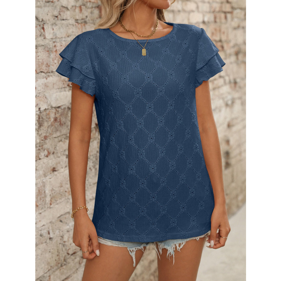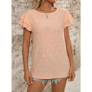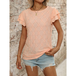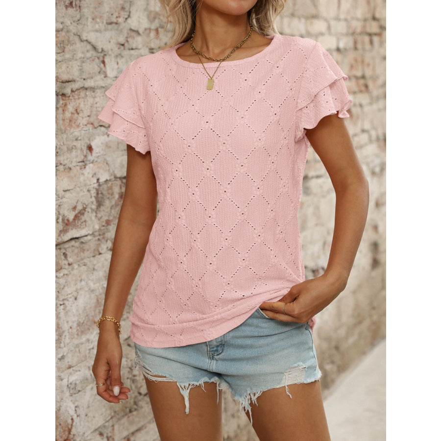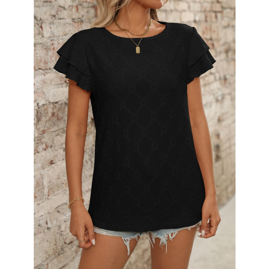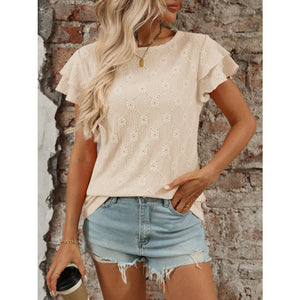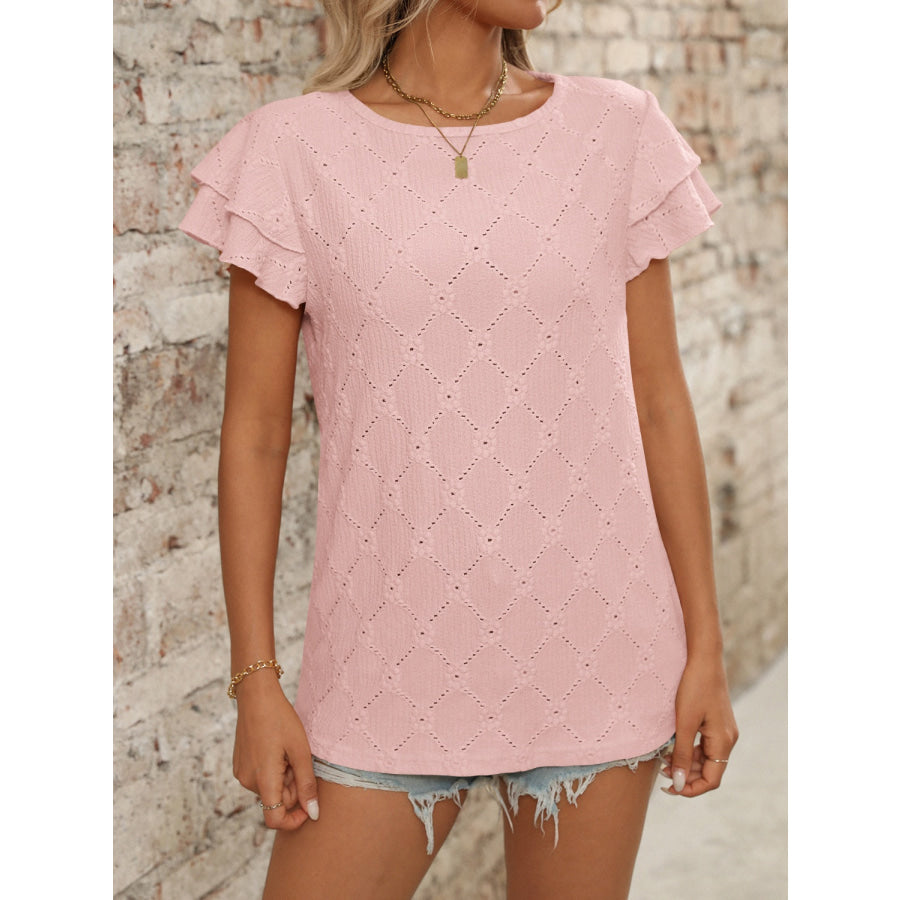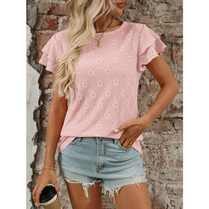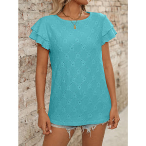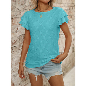 Eyelet Round Neck Double Layered Ruffled Short Sleeve Top