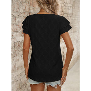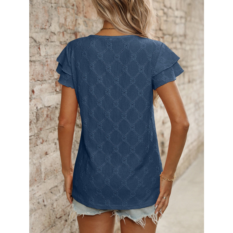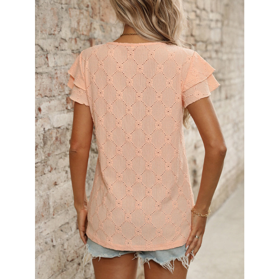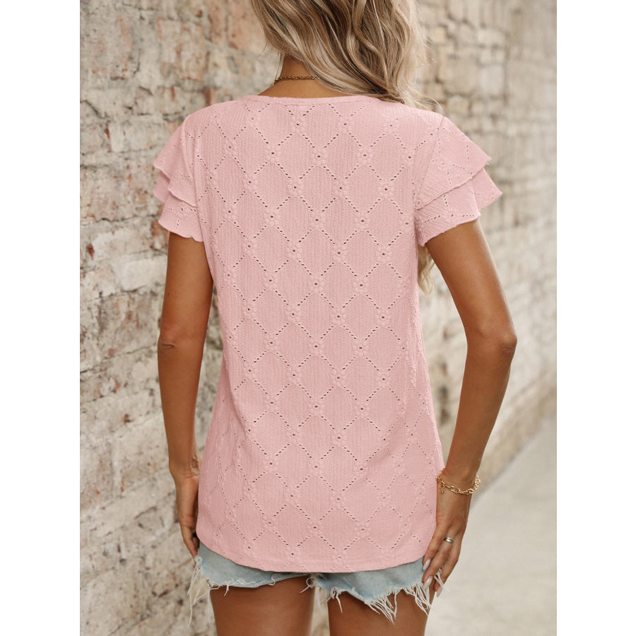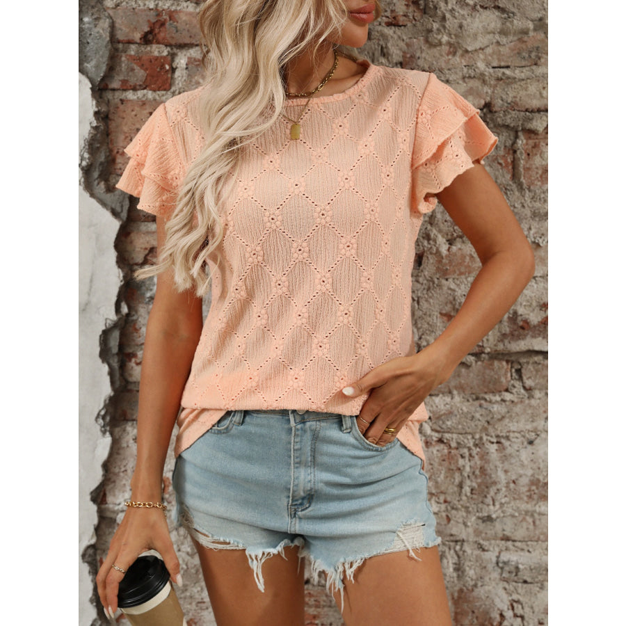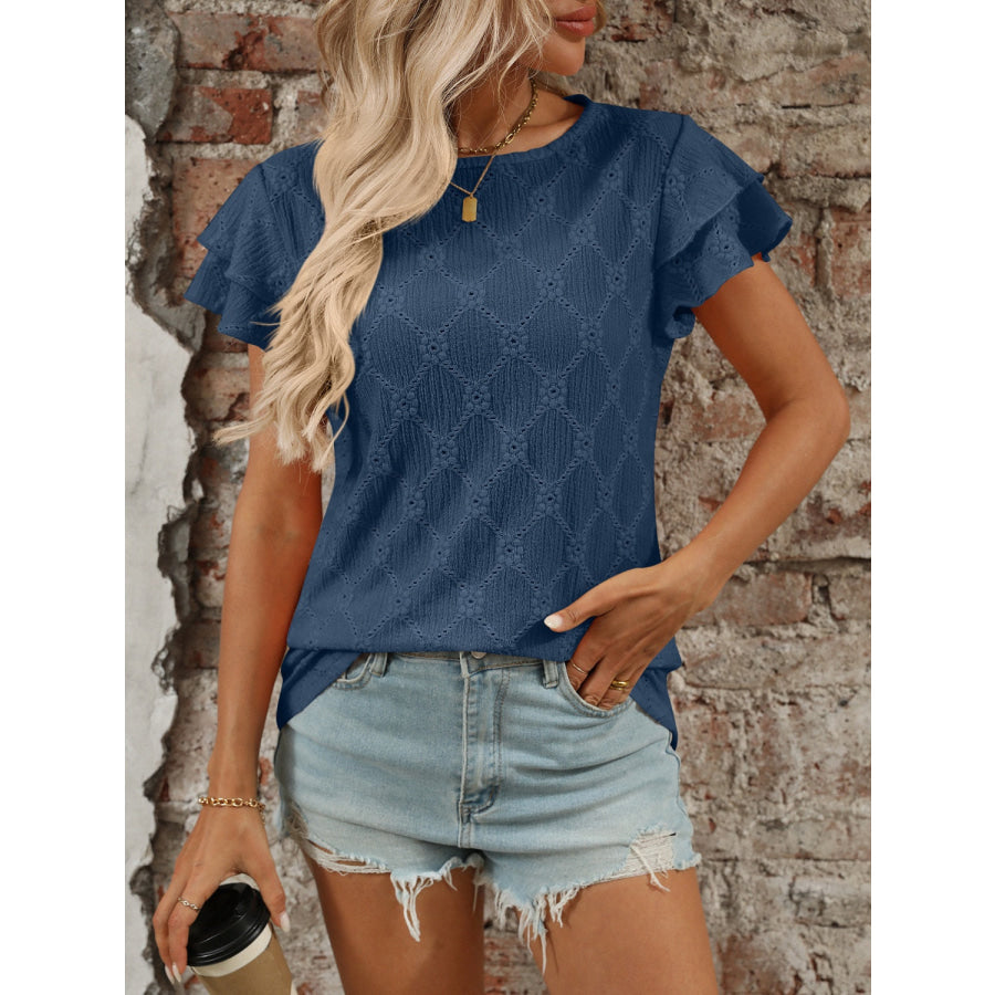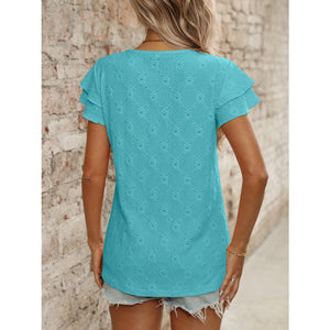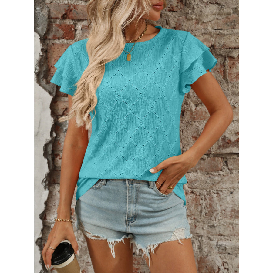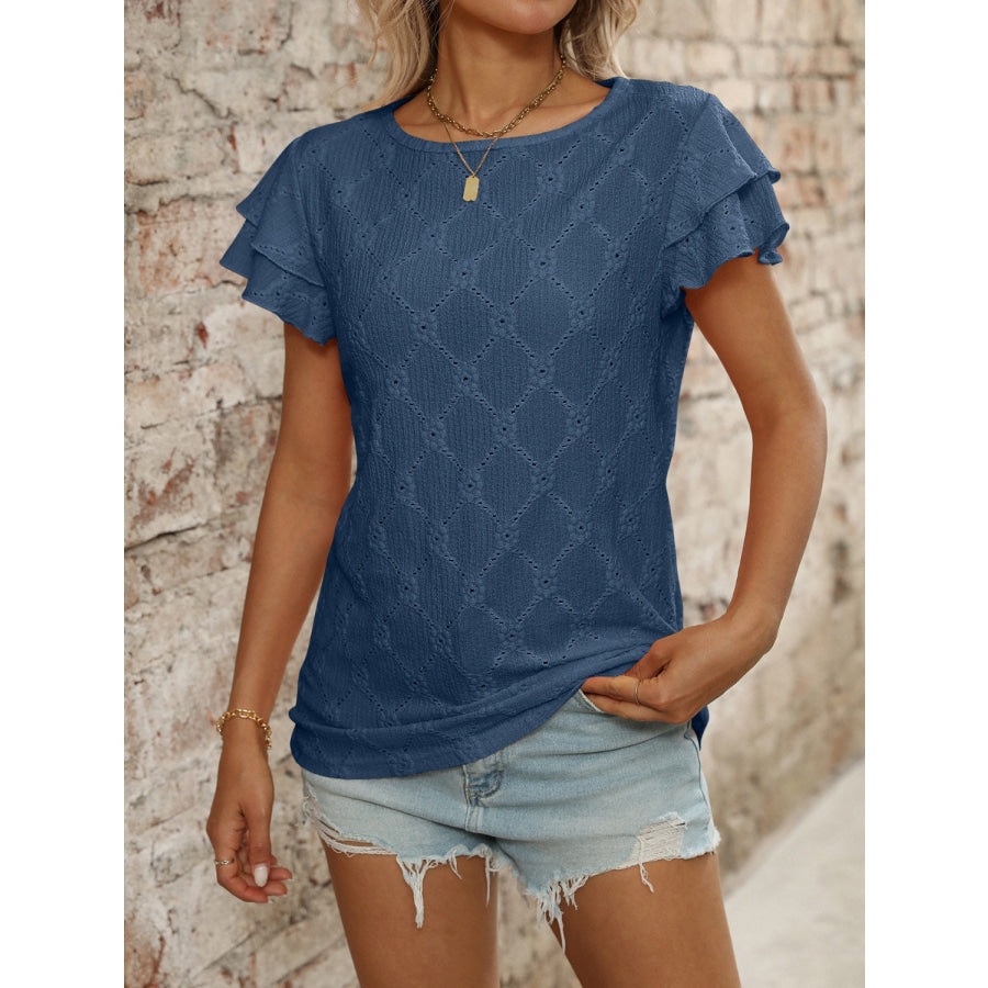 Eyelet Round Neck Double Layered Ruffled Short Sleeve Top