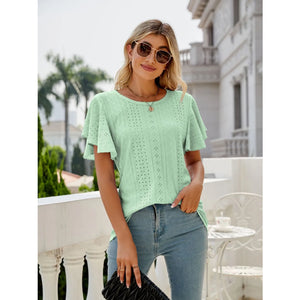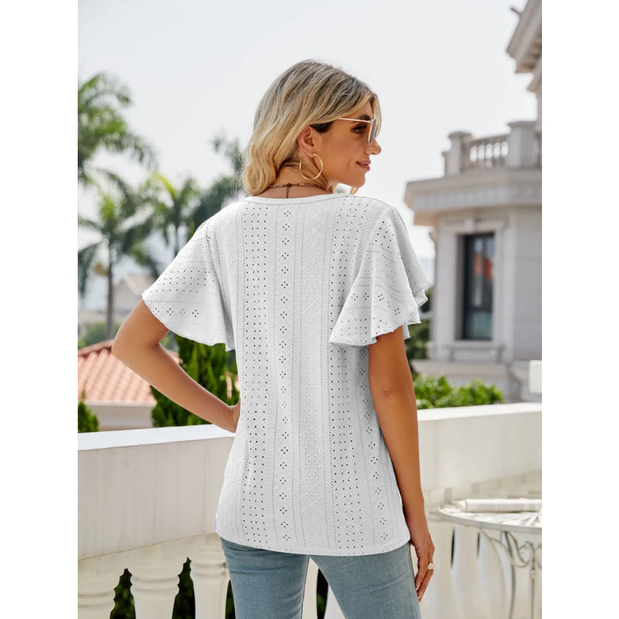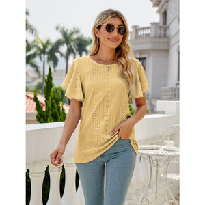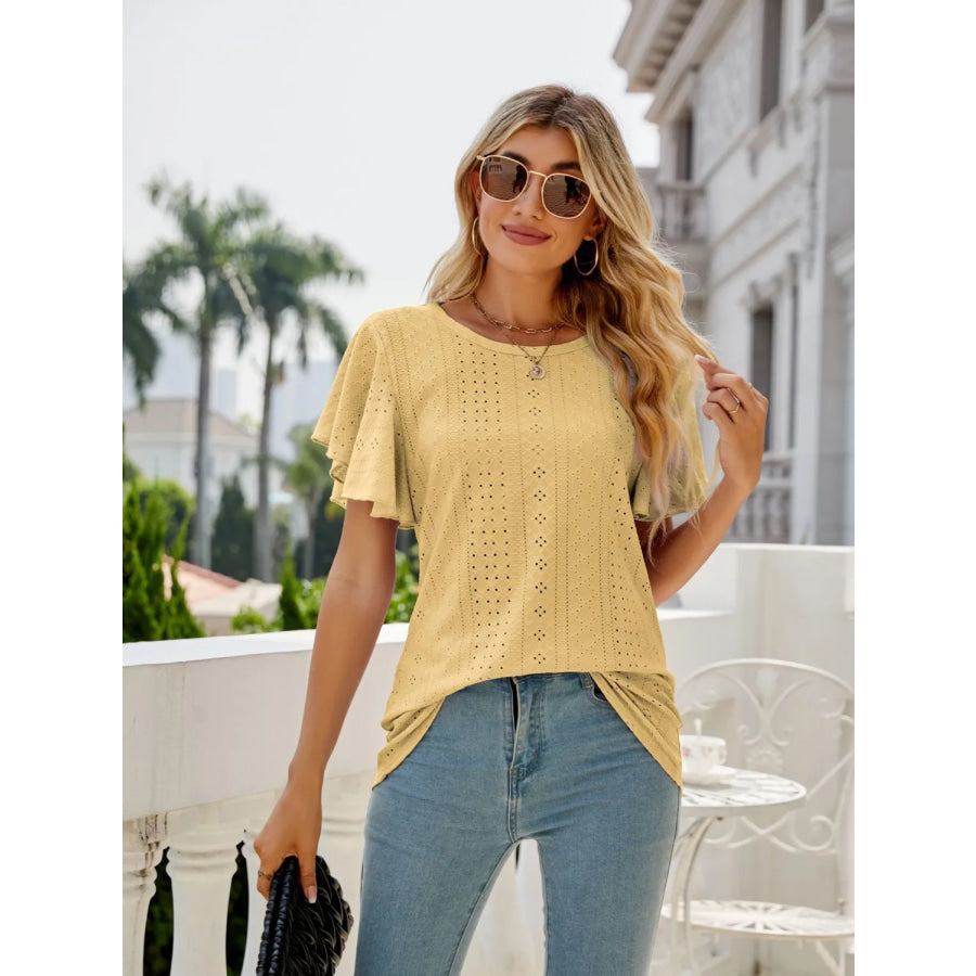 Eyelet Round Neck Flutter Sleeve T-Shirt