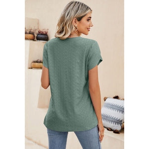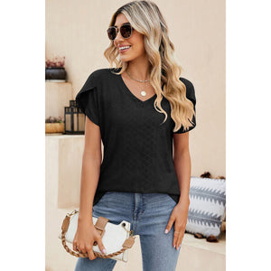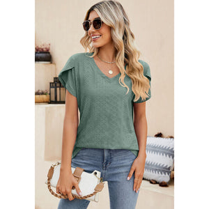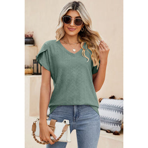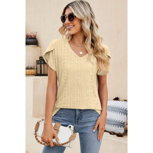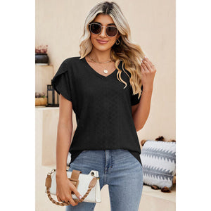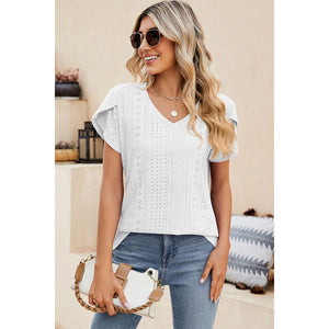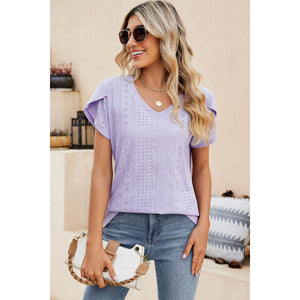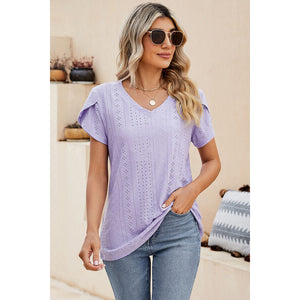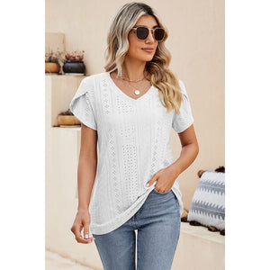 Eyelet V-Neck Petal Sleeve T-Shirt