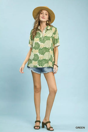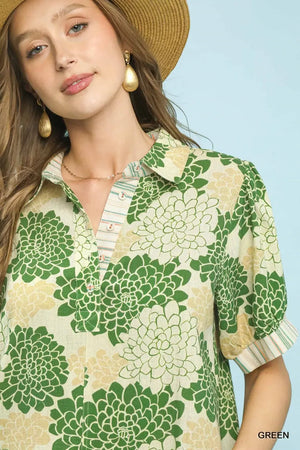 The Floral Collared Short Sleeve Blouse is a charming and versatile piece for your wardrobe. Made from linen, this blouse offers a lightweight and breathable feel. The floral print with multi-stripe contrast adds a cheerful and vibrant touch to the design. Featuring a collared V-placket, this blouse exudes a classic and polished look. The short sleeves with striped contrast cuffs provide a trendy and stylish detail. Perfect for adding a pop of color and femininity to your outfit, the Floral Collared Short Sleeve Blouse is a chic and playful top for various occasions.