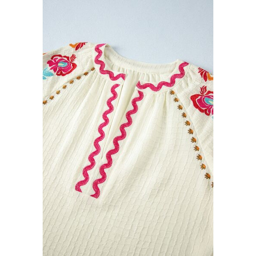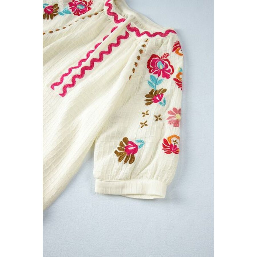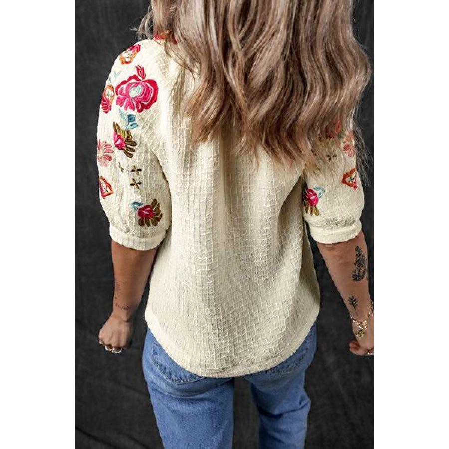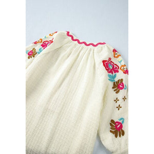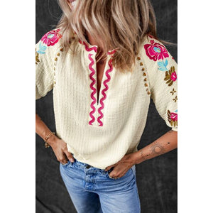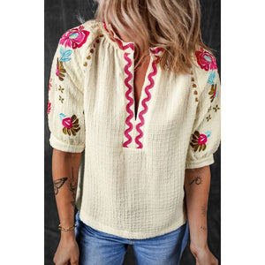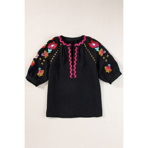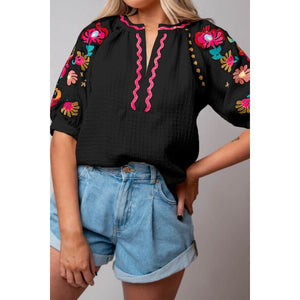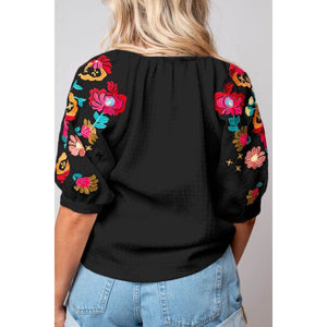 Floral Embroidered Notched Puff Sleeve Blouse