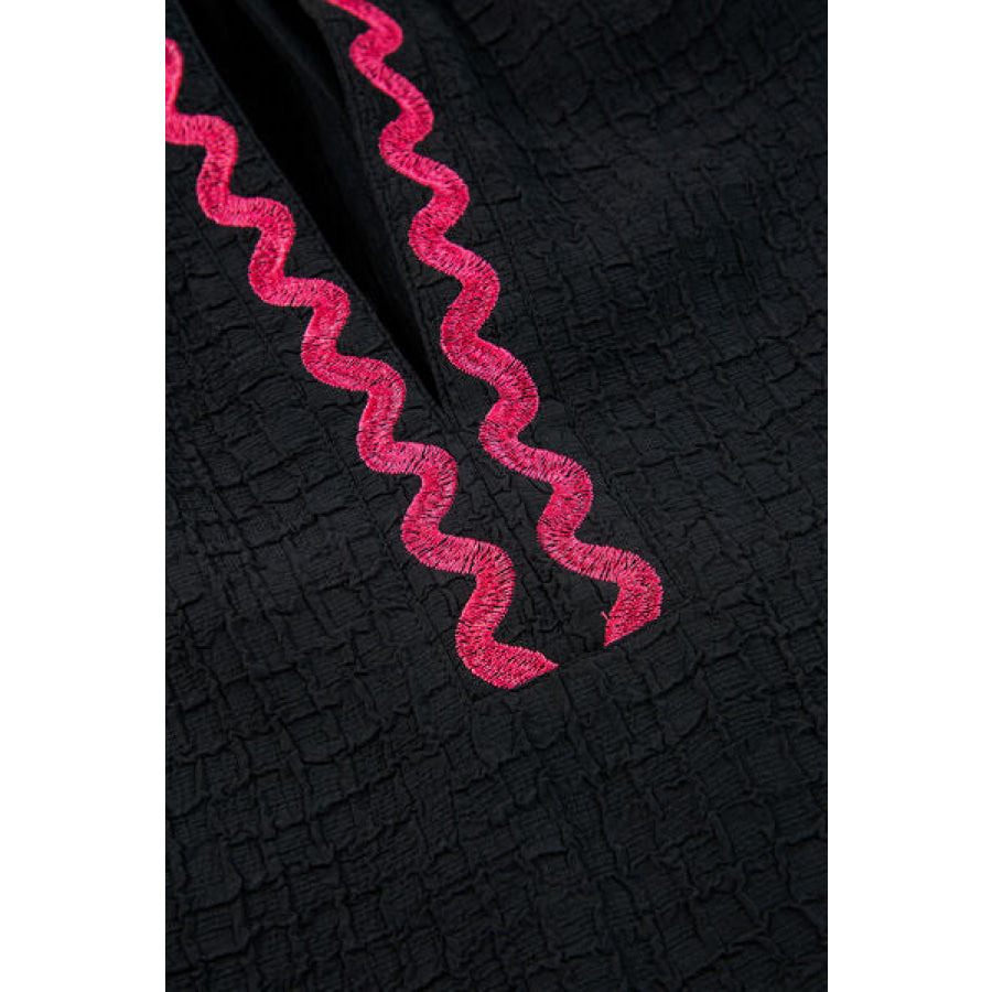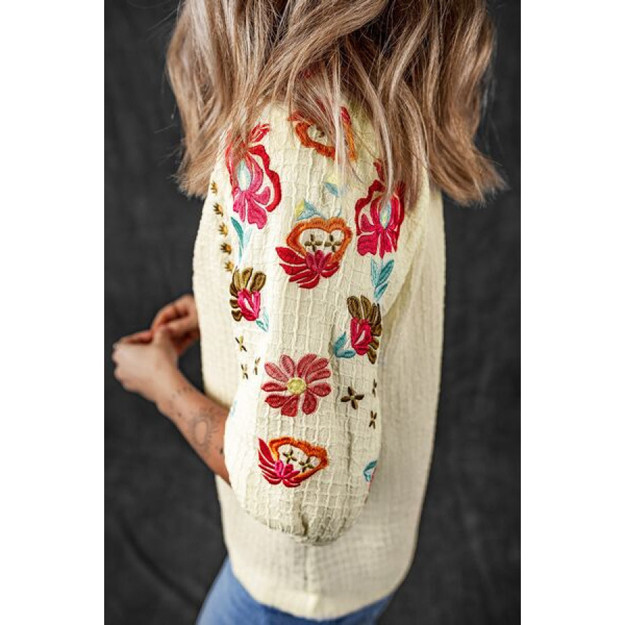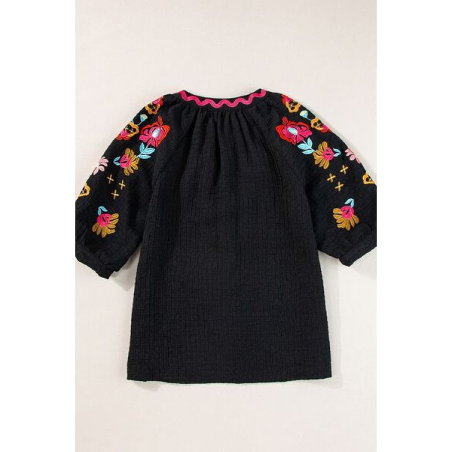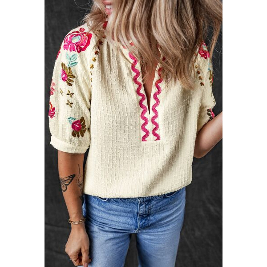 Floral Embroidered Notched Puff Sleeve Blouse