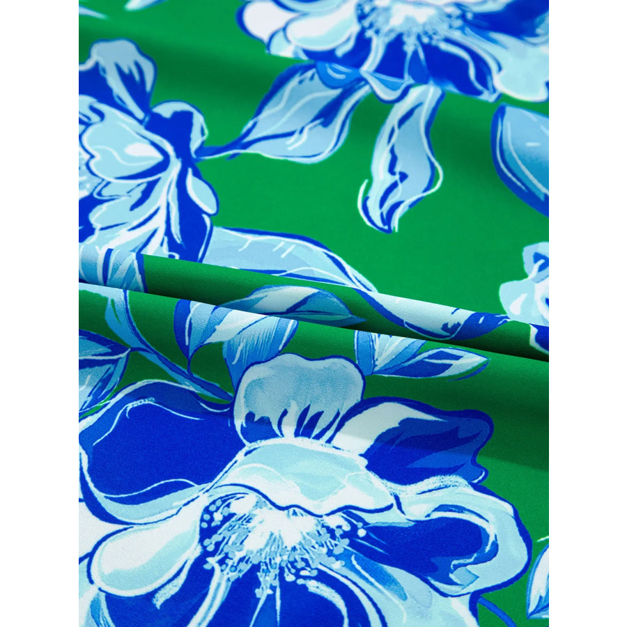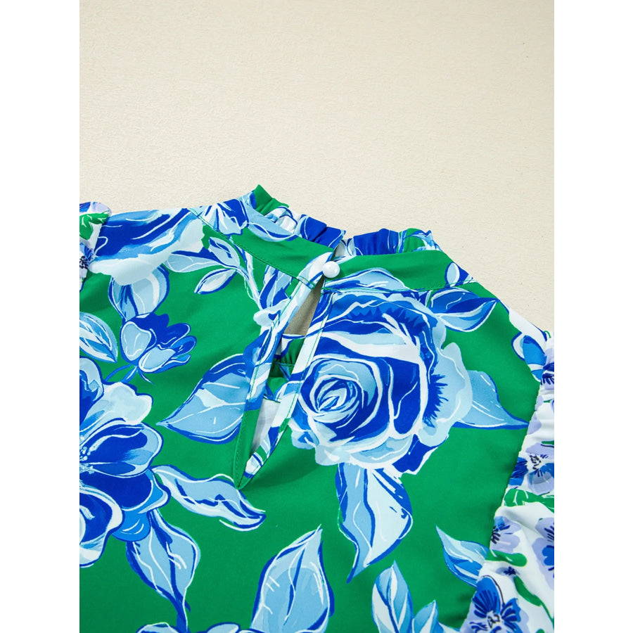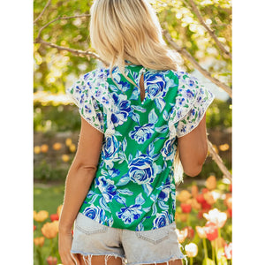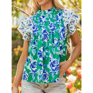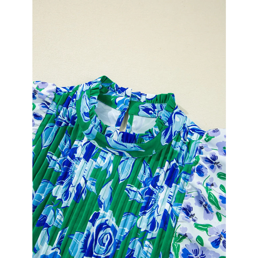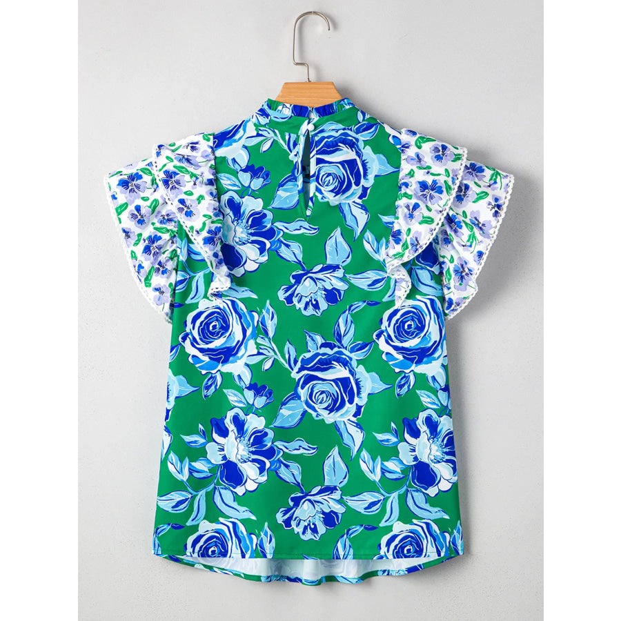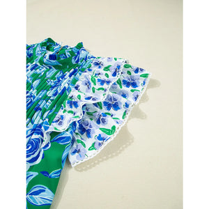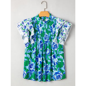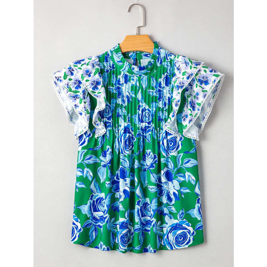 Floral Lace Trim Contrast Ruffle Sleeve Pleated Loose Blouse