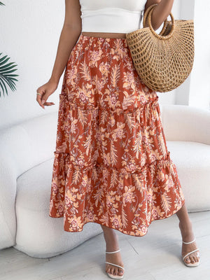 Floral Print Ruffle Hem Flowy Midi Skirt