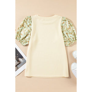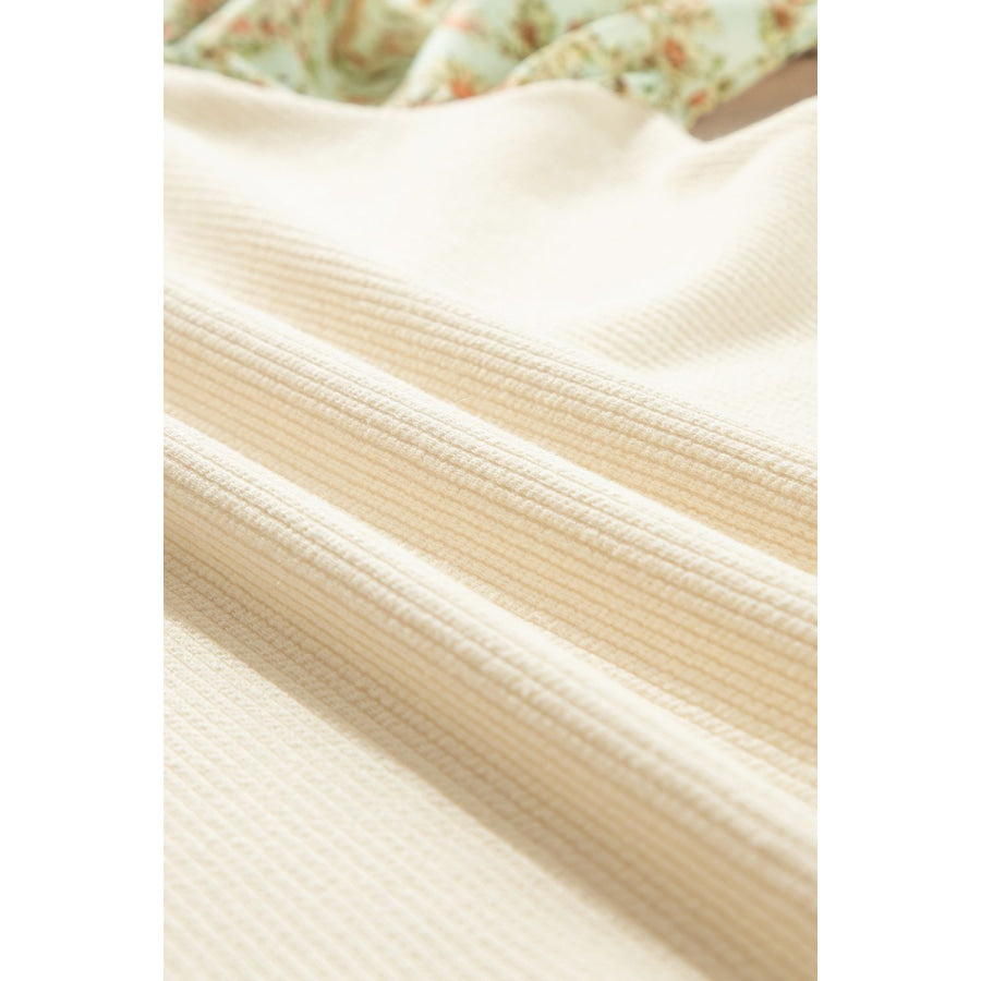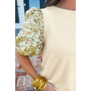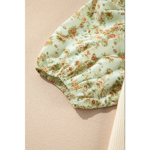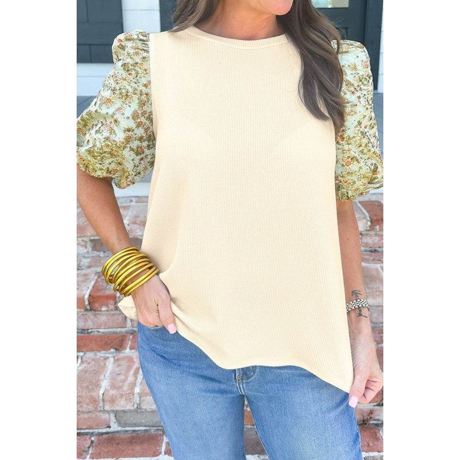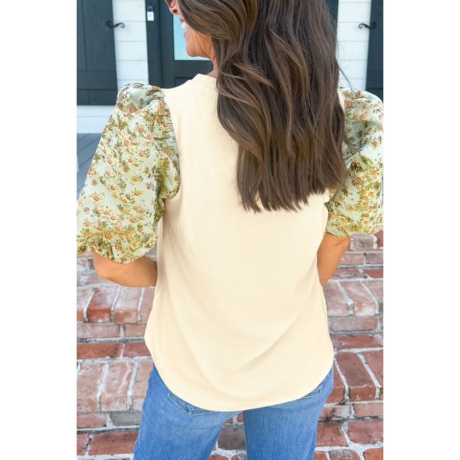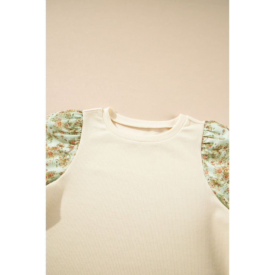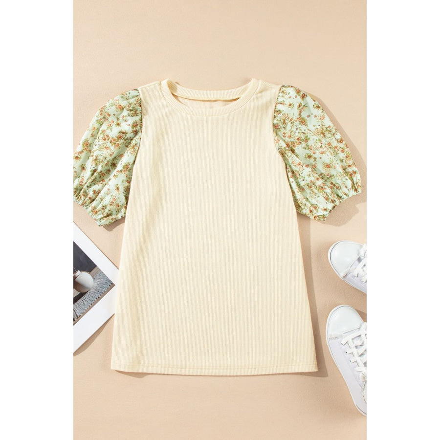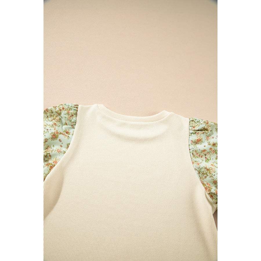 Floral Puff Sleeve Ribbed Blouse