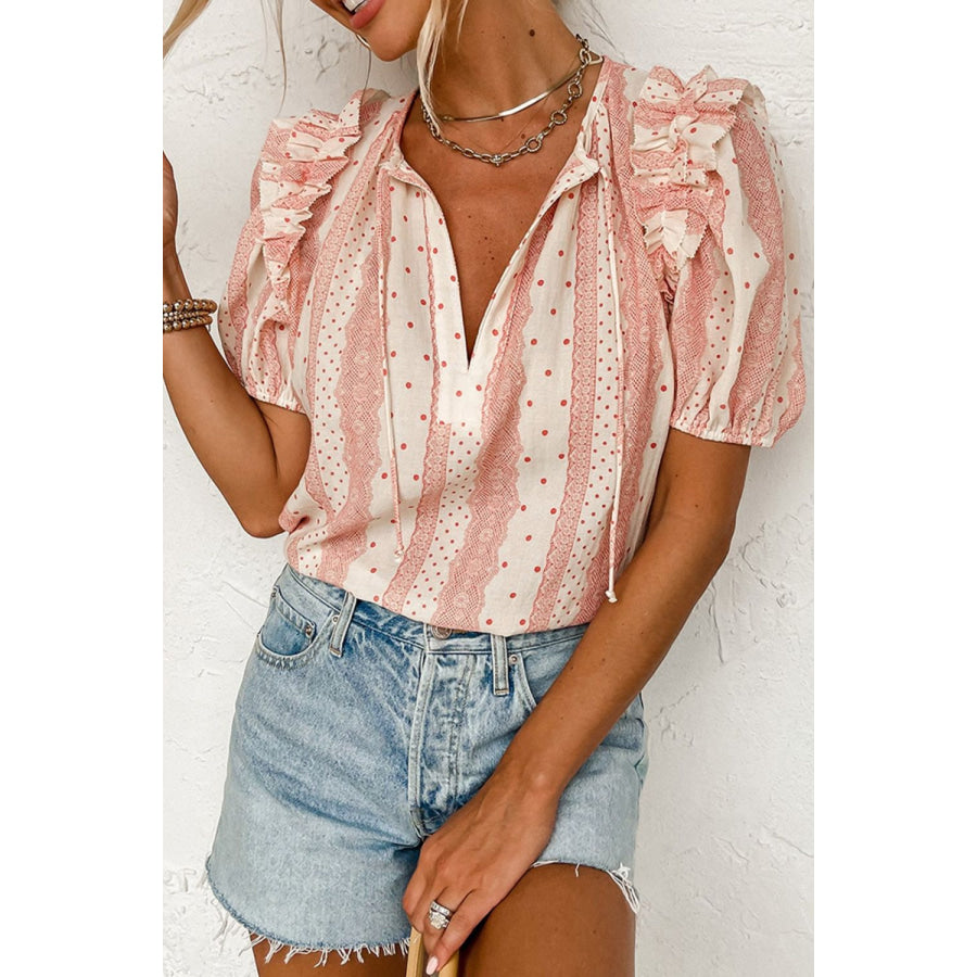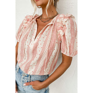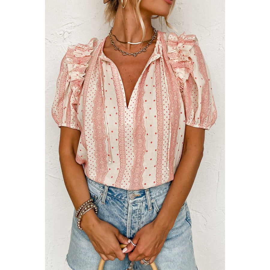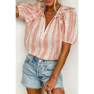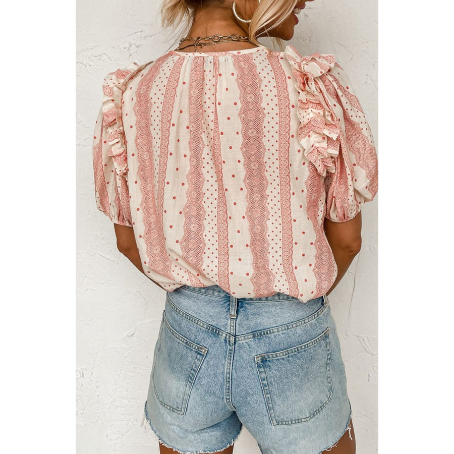 Frilled Short Puff Sleeve Mixed Print Blouse
