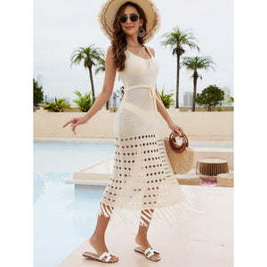 Fringe Hem Drawstring Waist Split Cover Up Dress