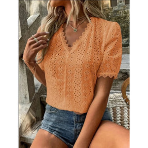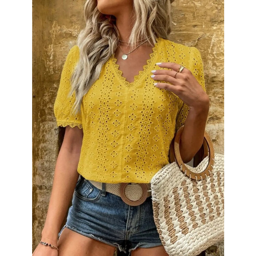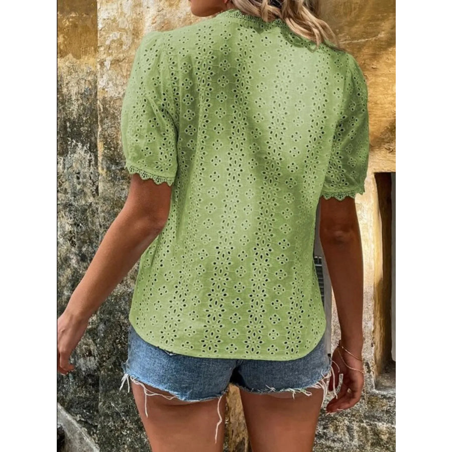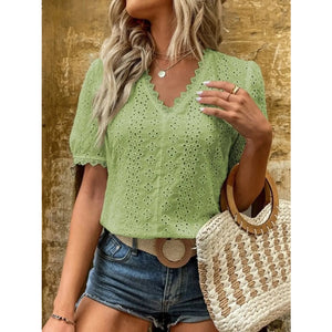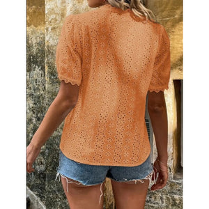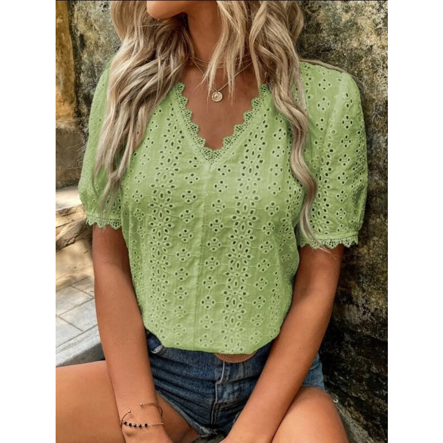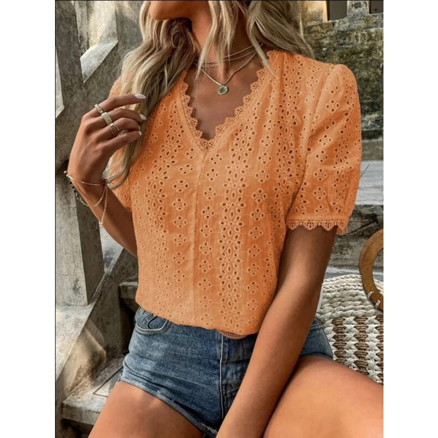 Full Size Lace Detail Eyelet V-Neck Short Sleeve Blouse Plus Size