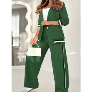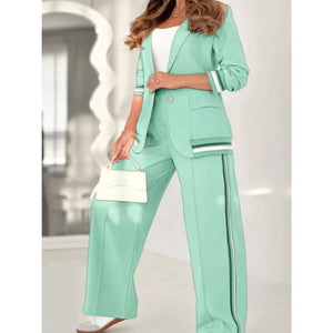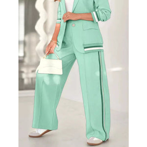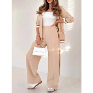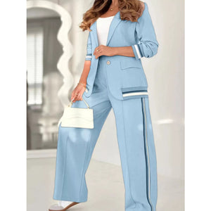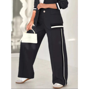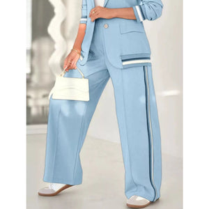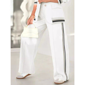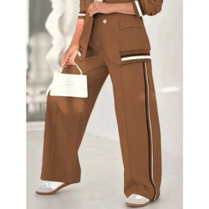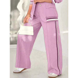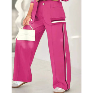 Full Size Striped Trim Button Down Jacket and Pants Set Plus Size