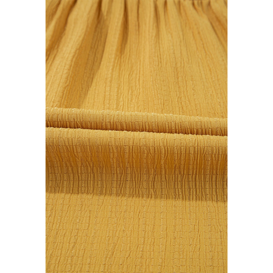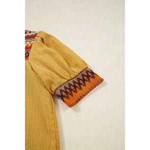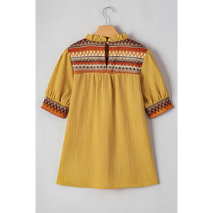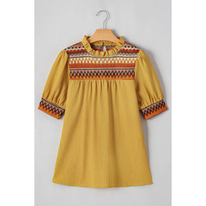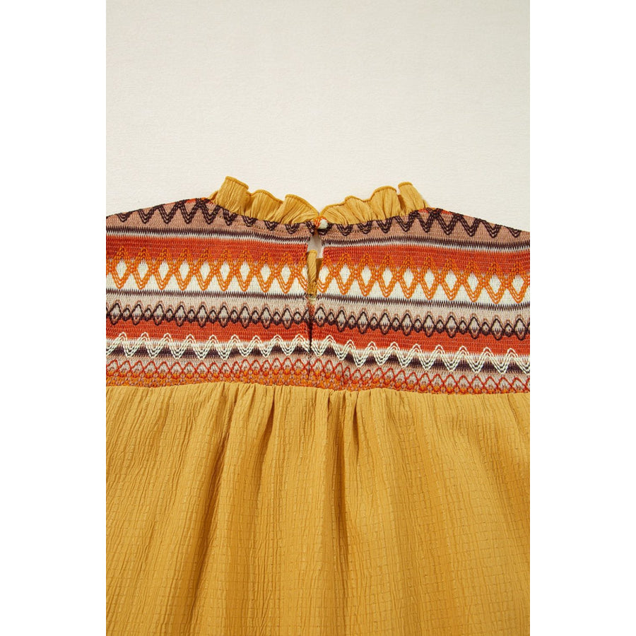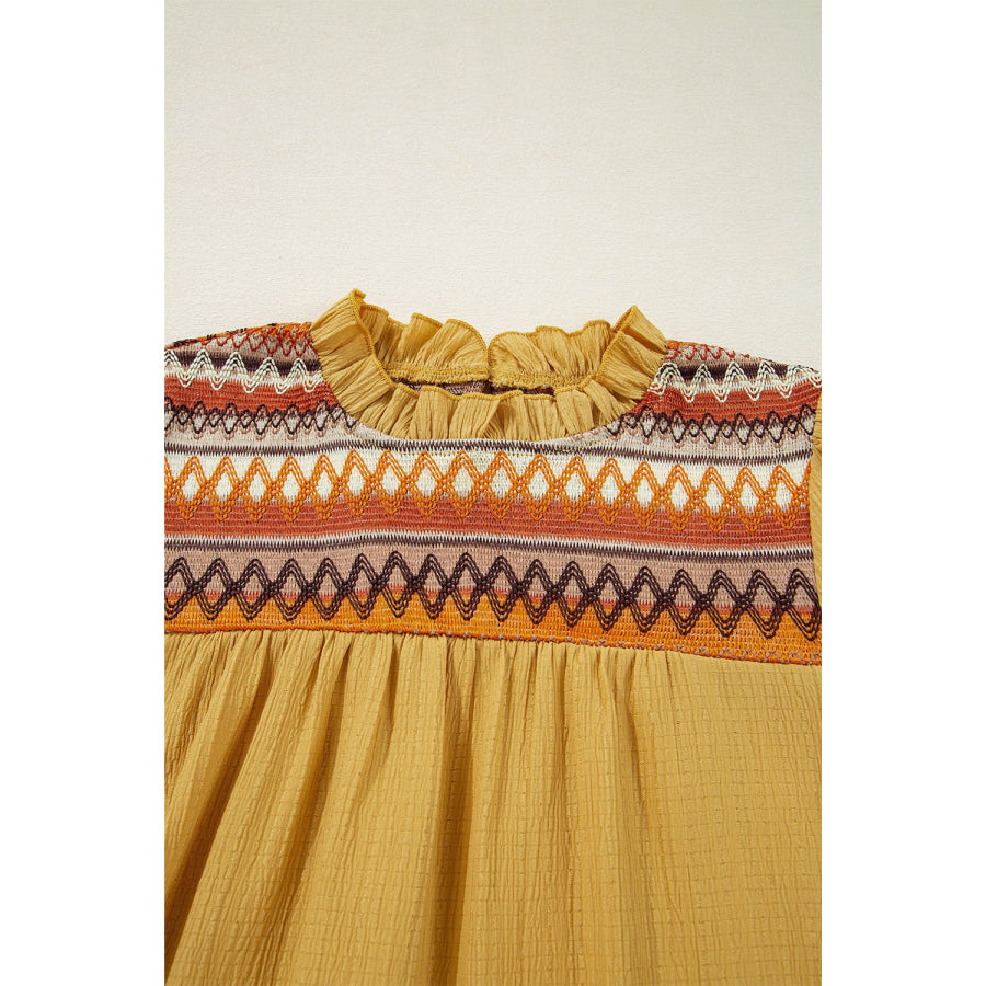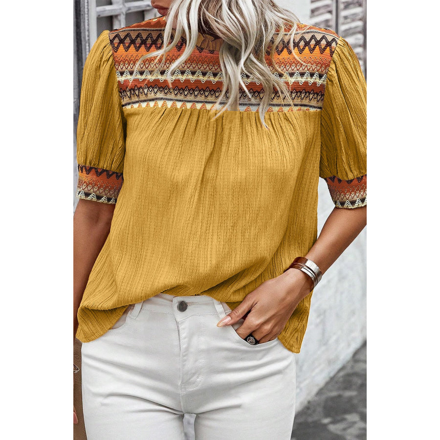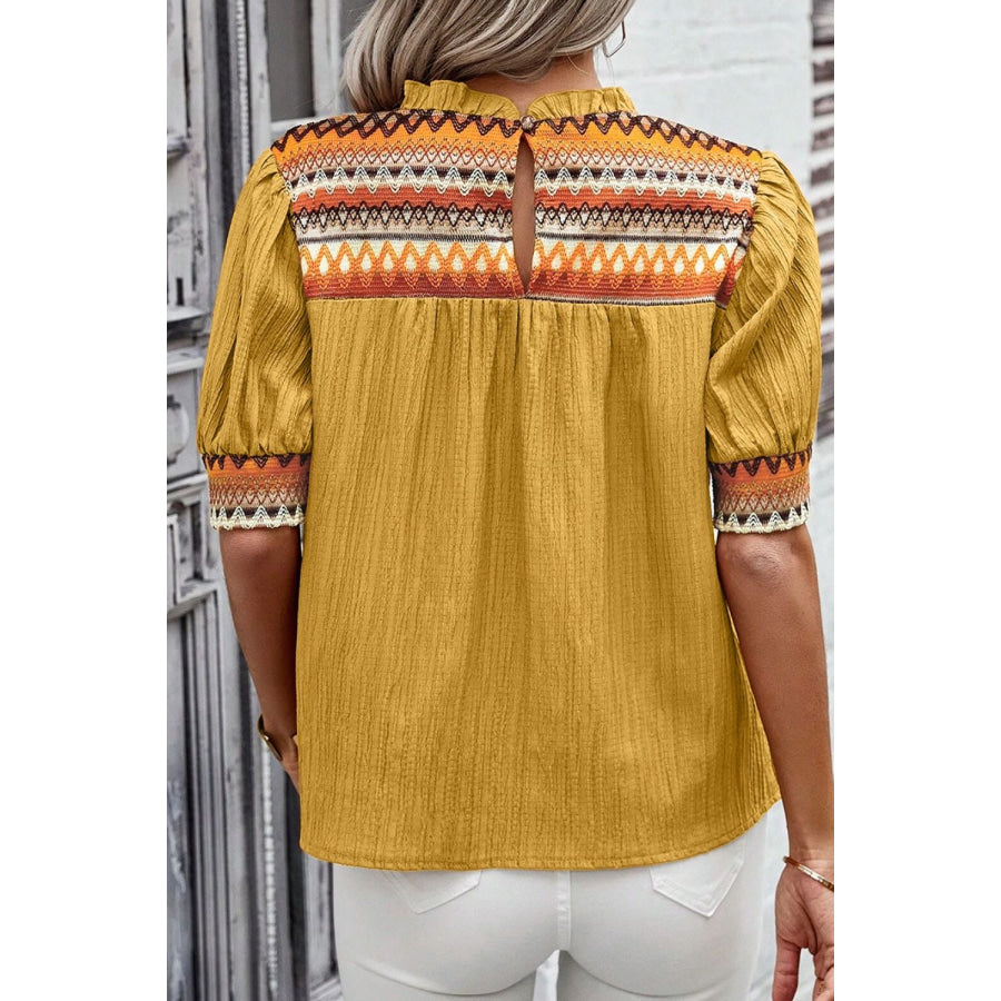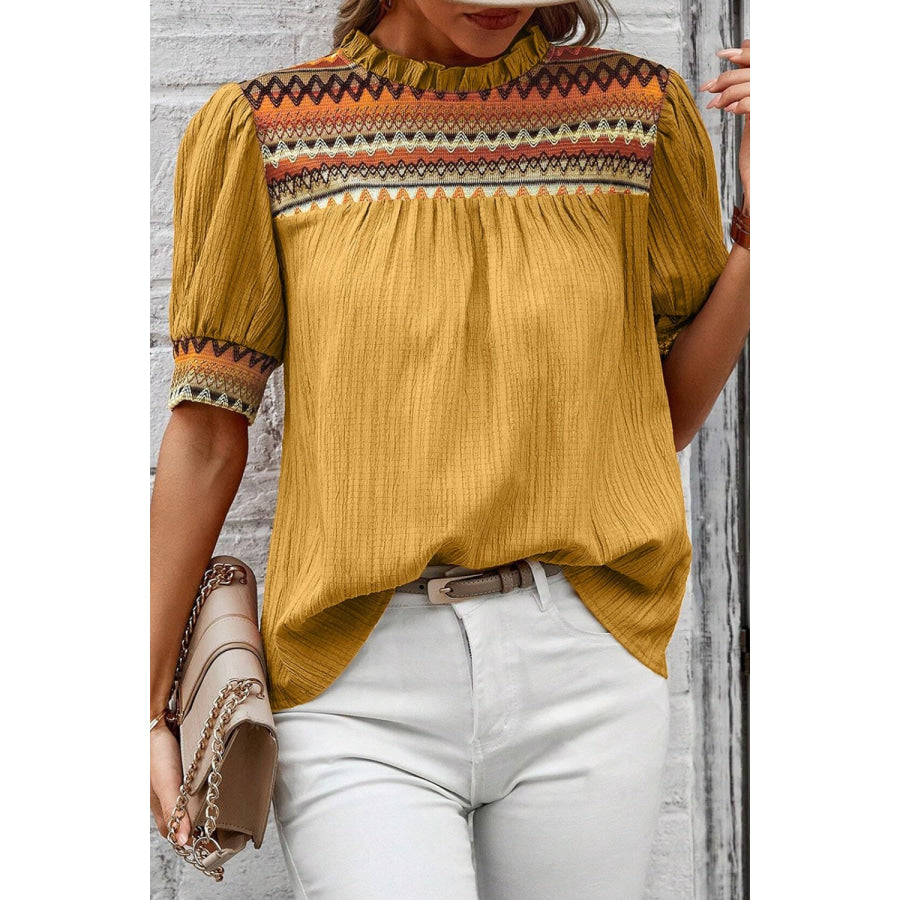 Geometric Frill Mock Neck Short Sleeve Blouse