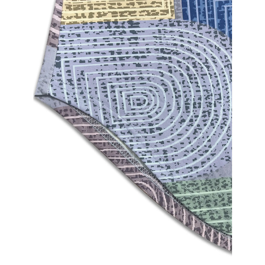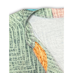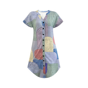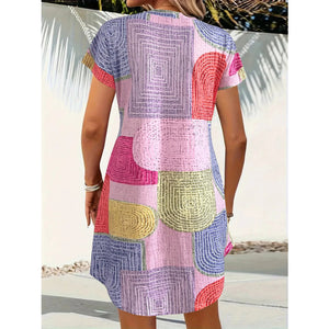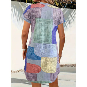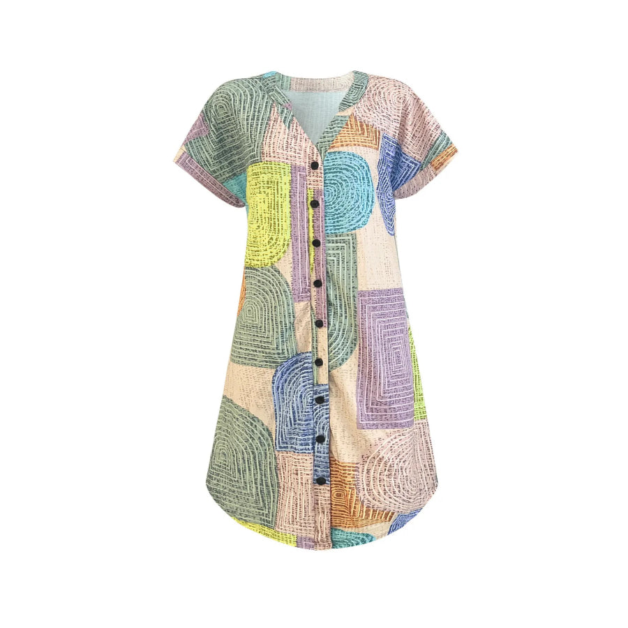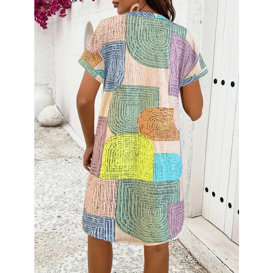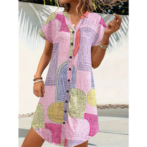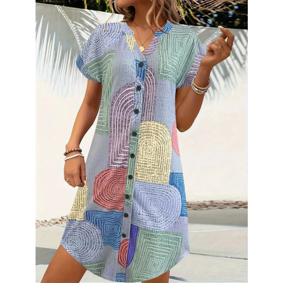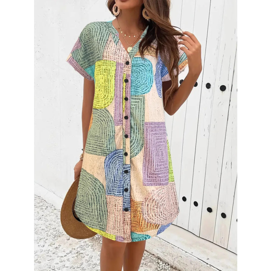 Geometric V-Neck Short Sleeve Button-Front Dress