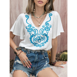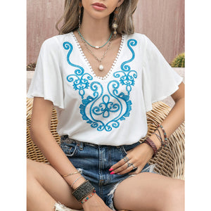 Graphic V-Neck Flutter Sleeve T-Shirt