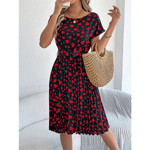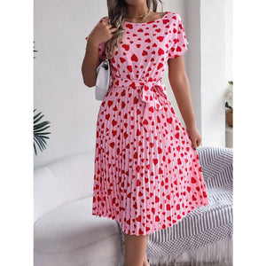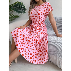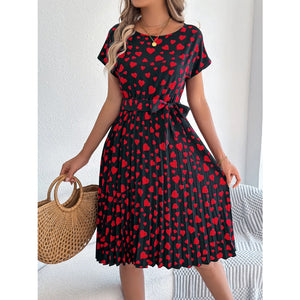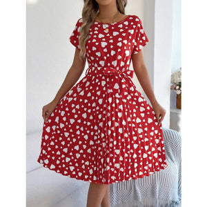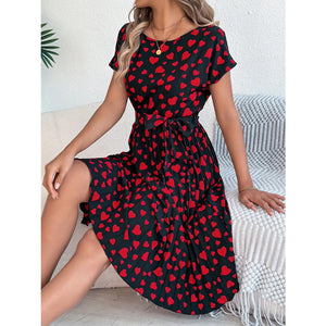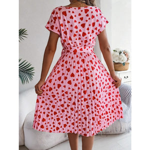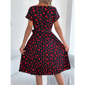 Heart Print Short Sleeve Tie Waist Dress