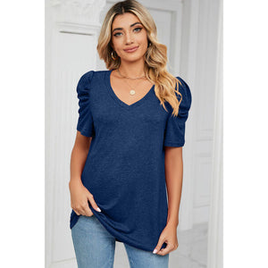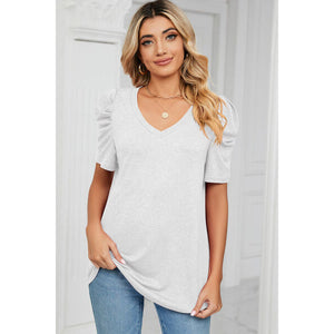 Heathered V-Neck Puff Sleeve T-Shirt